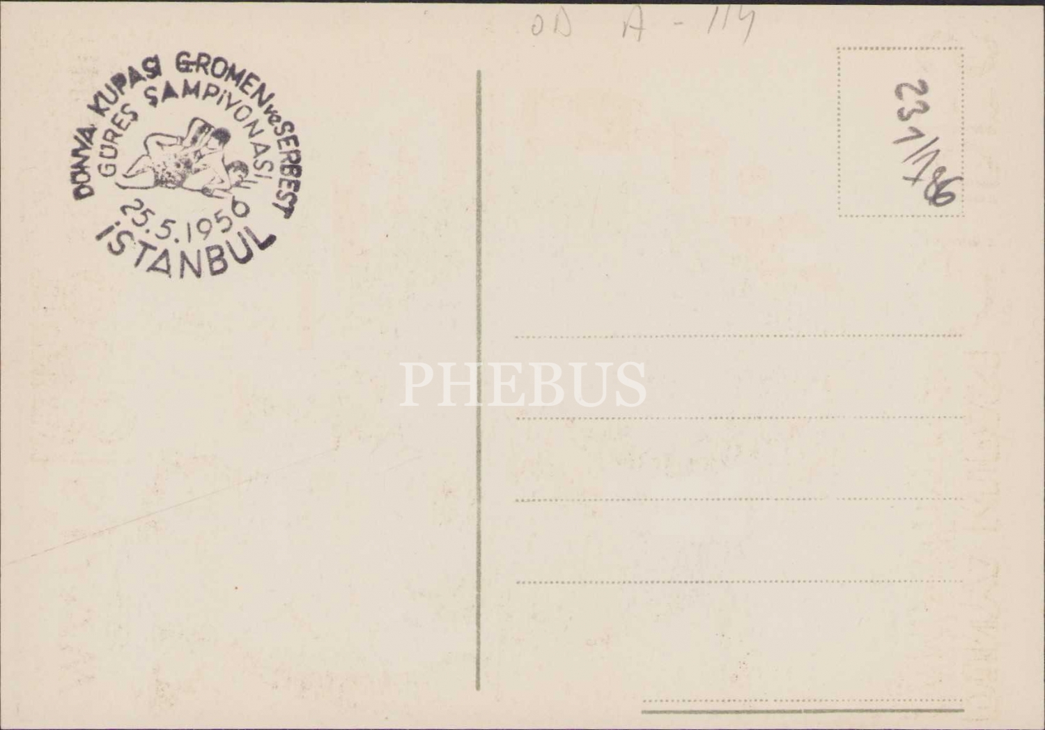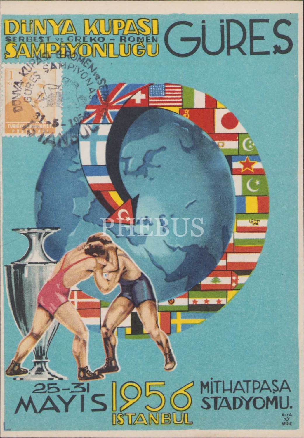 Güreş Dünya Kupası Serbest ve Greko-Romen Şampiyonluğu, 25-31 Mayıs 1956 tarihli, Mithatpaşa Stadyumu, damgalı, 10x14 cm.