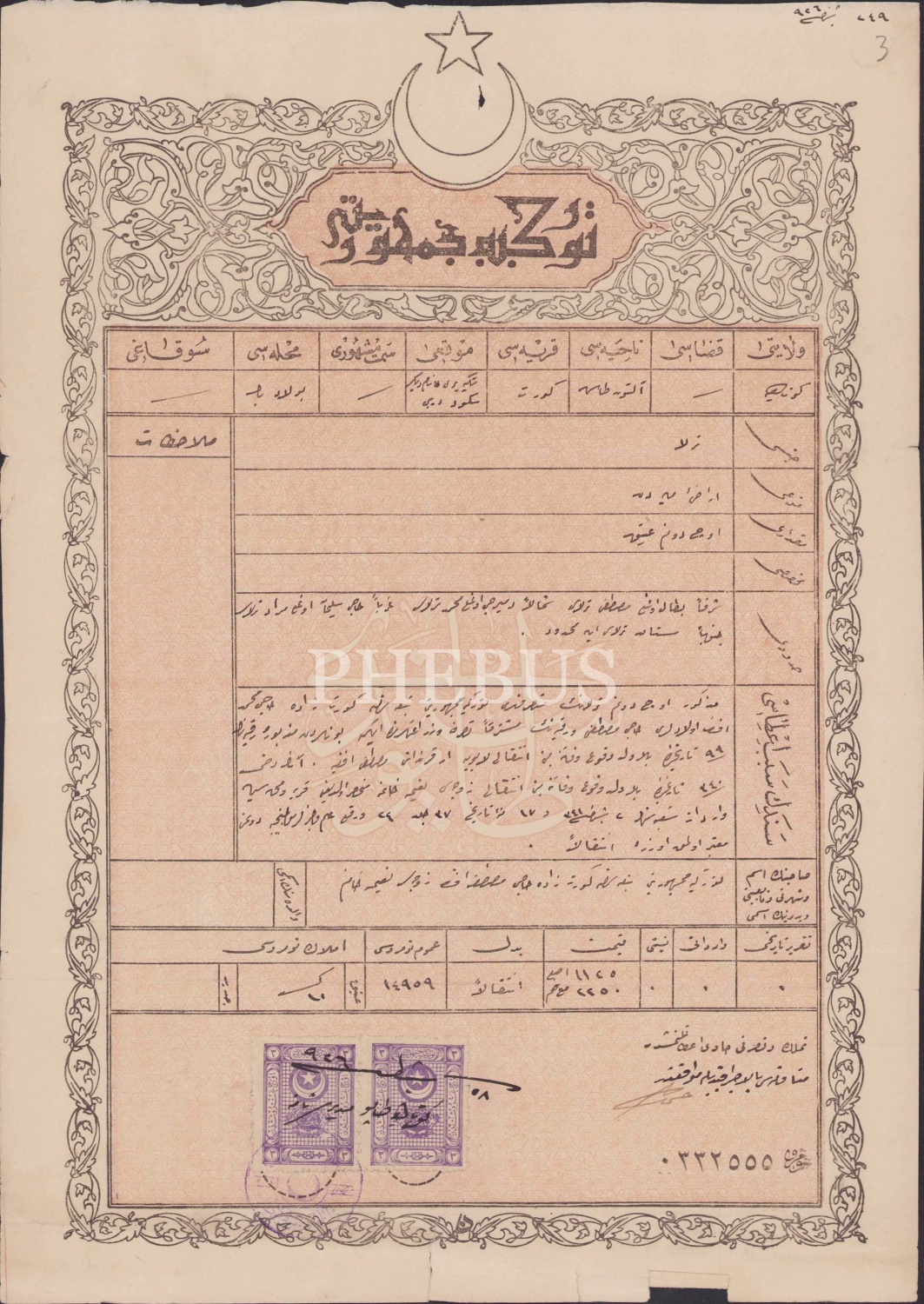 Türkiye Cumhuriyeti antetli tarla tapusu, Kütahya Vilayeti, Altuntaş Nahiyesi'nde, damgalı ve pullu, 1926 tarihli, 22,5x31 cm.