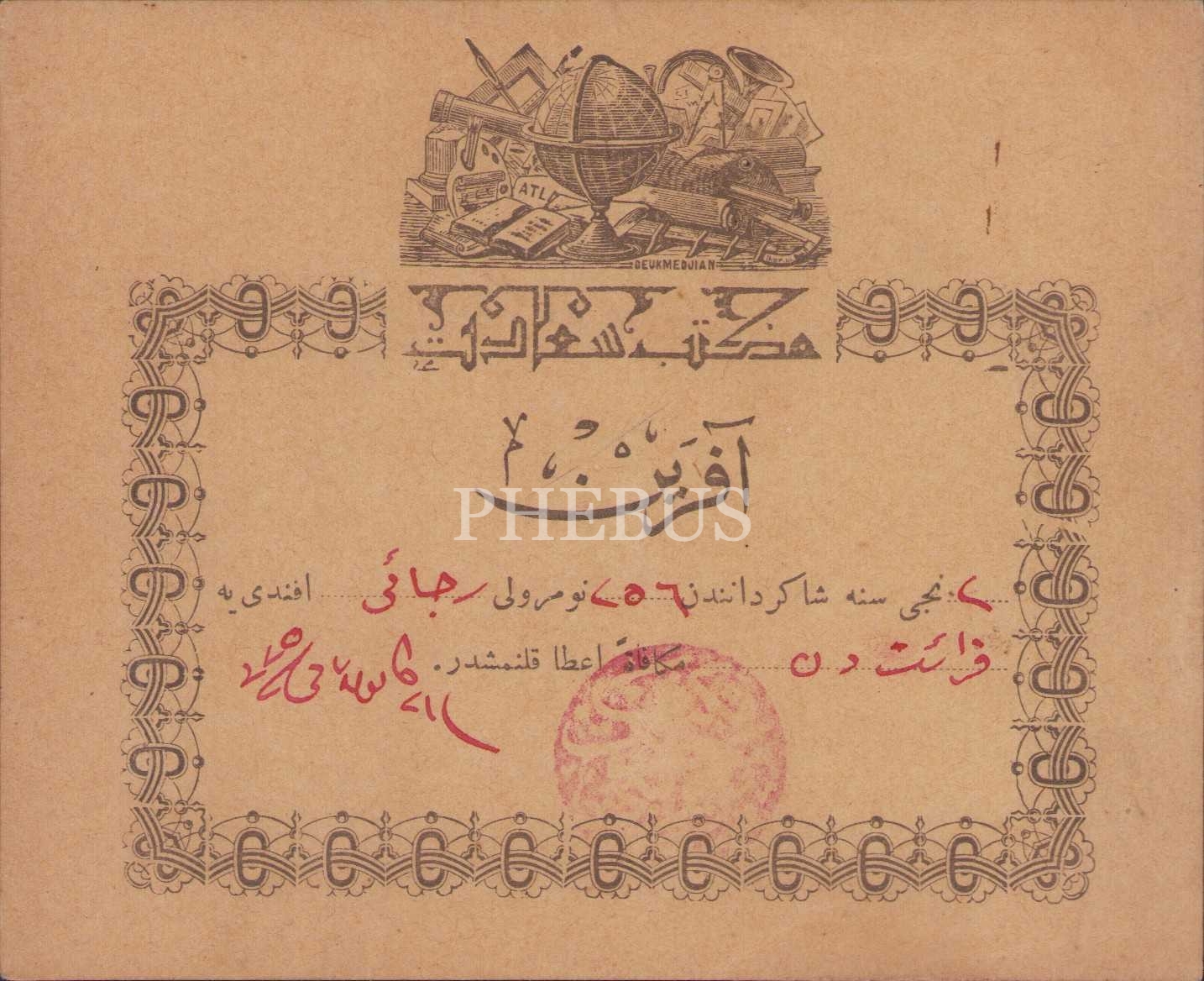 Osmanlıca Aferin Belgesi, 2. Sınıf Talebelerinden Recai Efendi'ye ait, 1325 tarihli, 12x10 cm.