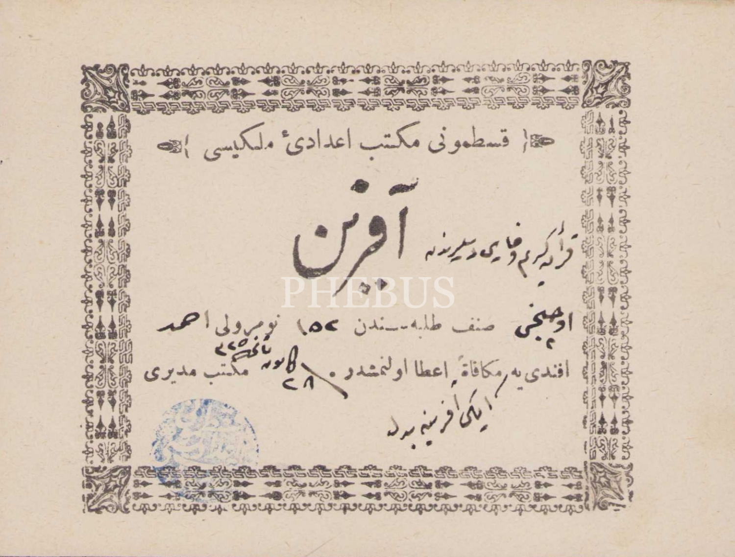 Kastamonu Mekteb-i İdadi-i Mülkiyesi Aferin Belgesi, Osmanlıca, Üçüncü Sınıf Talebesi Ahmed Efendi'ye ait, 1325 tarihli, 13,5x10 cm.