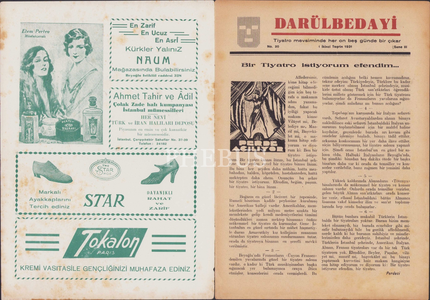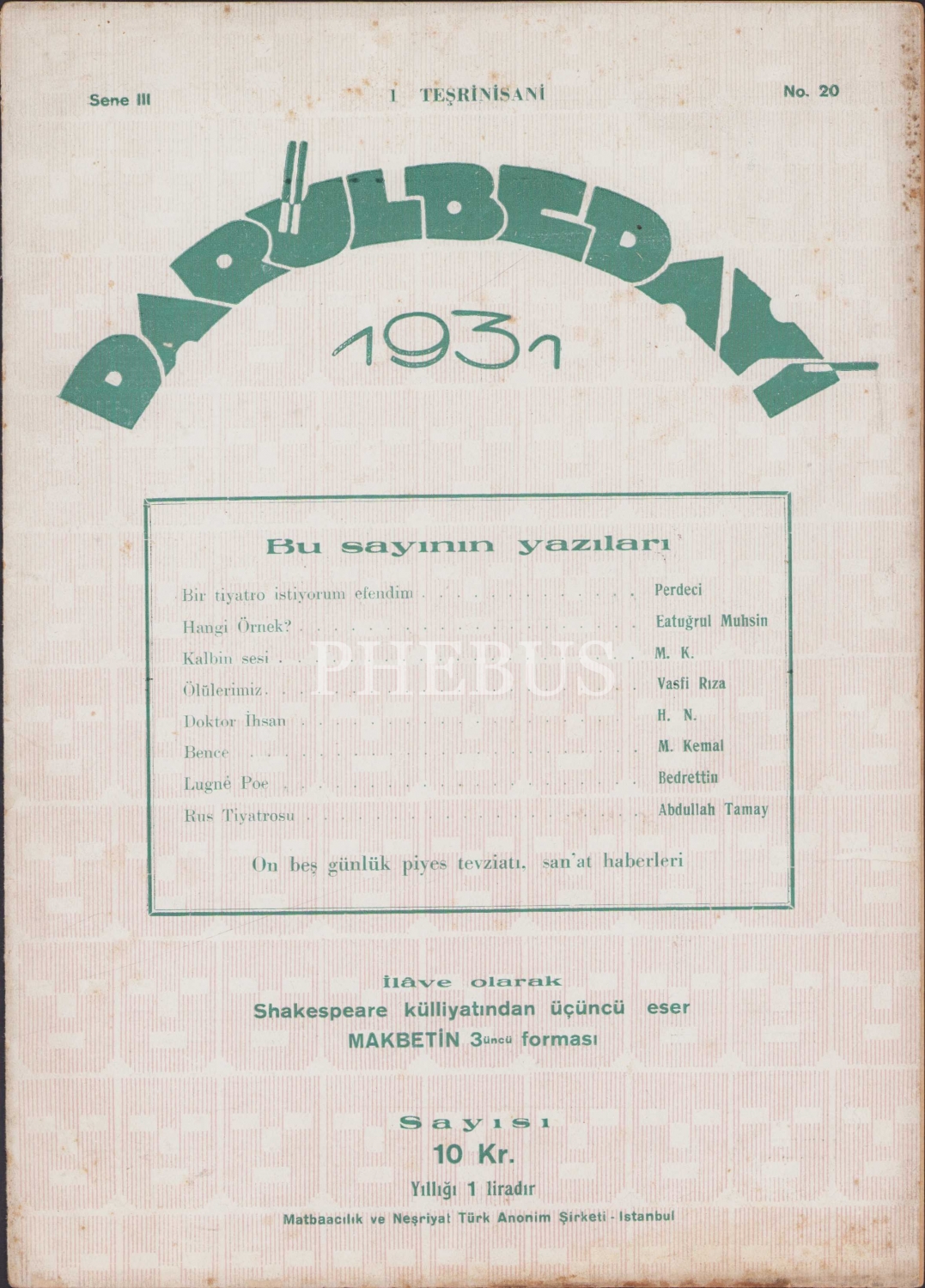 Darülbedayi Dergisi, 1 Teşrinisani 1931 tarihli, No: 20, Sene:3, 16 sayfa, 19x27 cm.