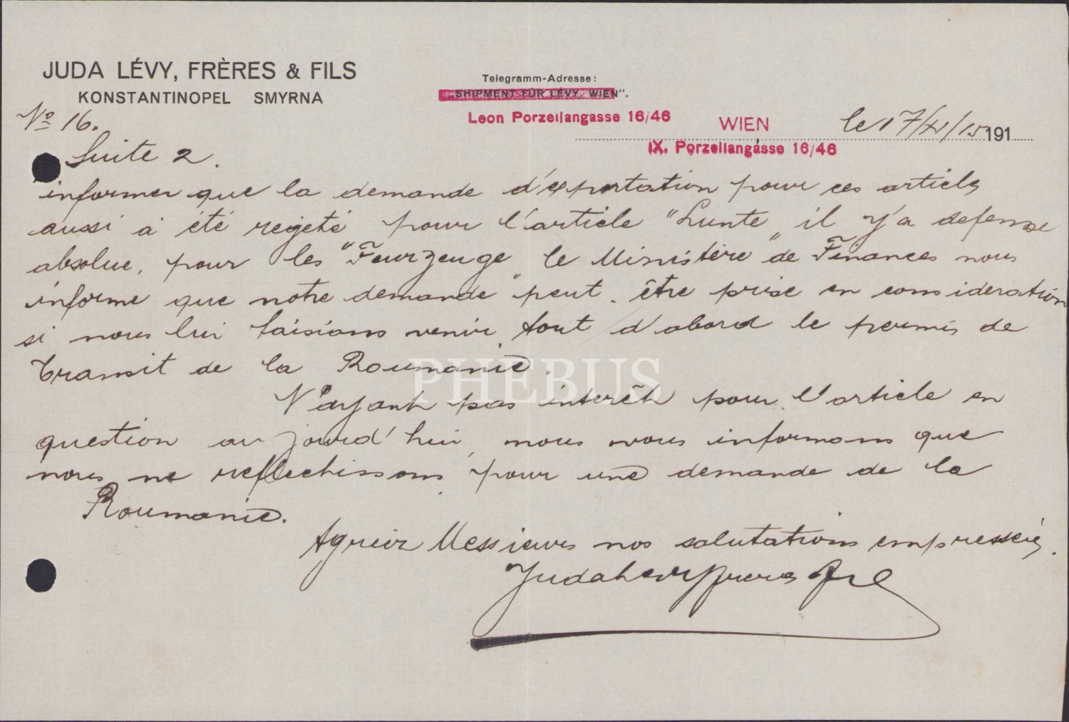 Juda Levy Freres Fils Konstantinopel Smyrna antetli Fransızca yazılı kağıt, Viyana, 1910'lar, 21x14 cm.