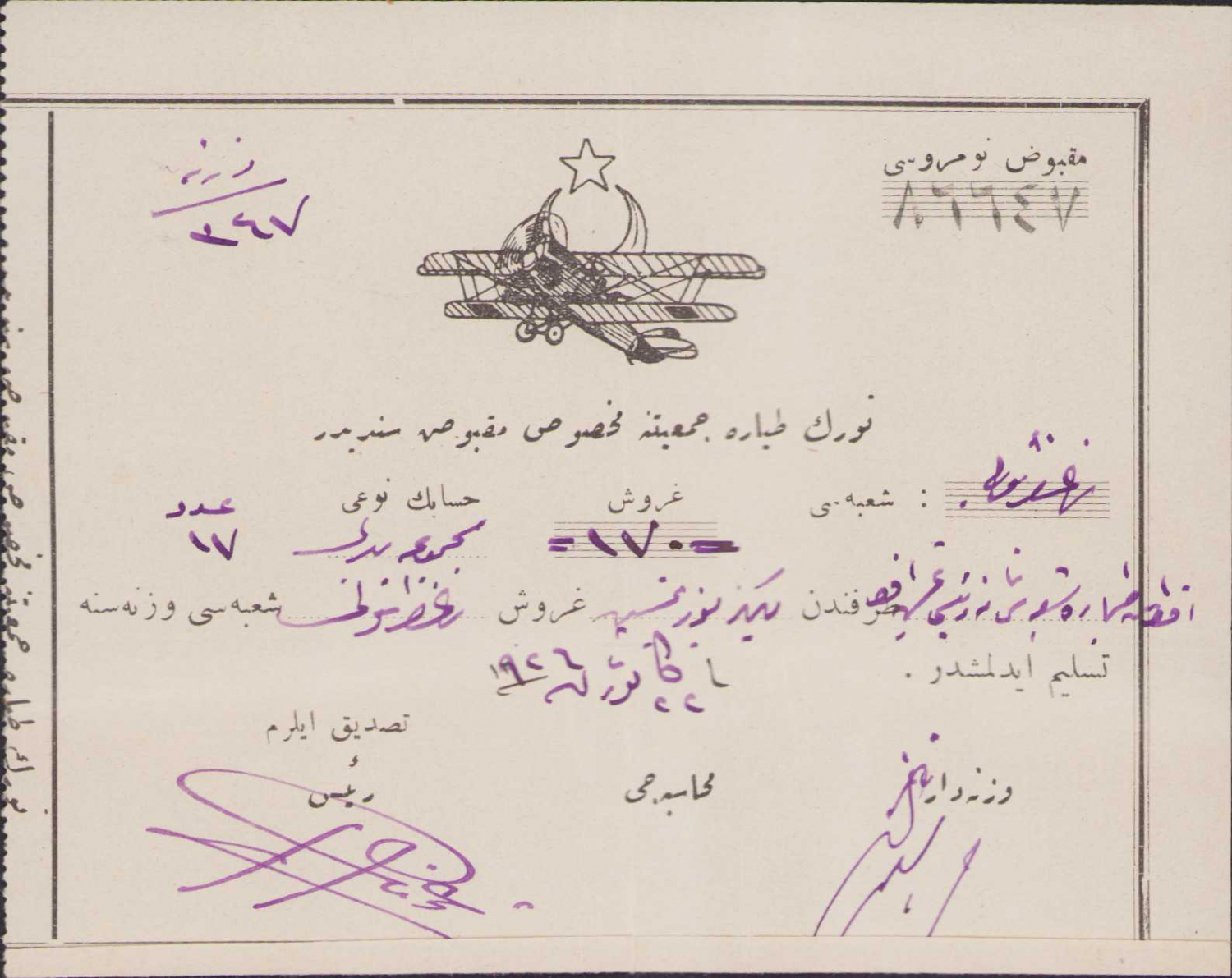 Osmanlı Türk Tayyare Cemiyeti'ne ait makbuz senedi
