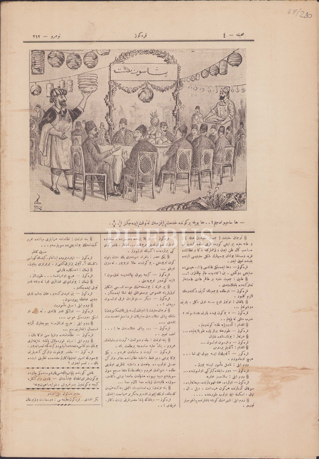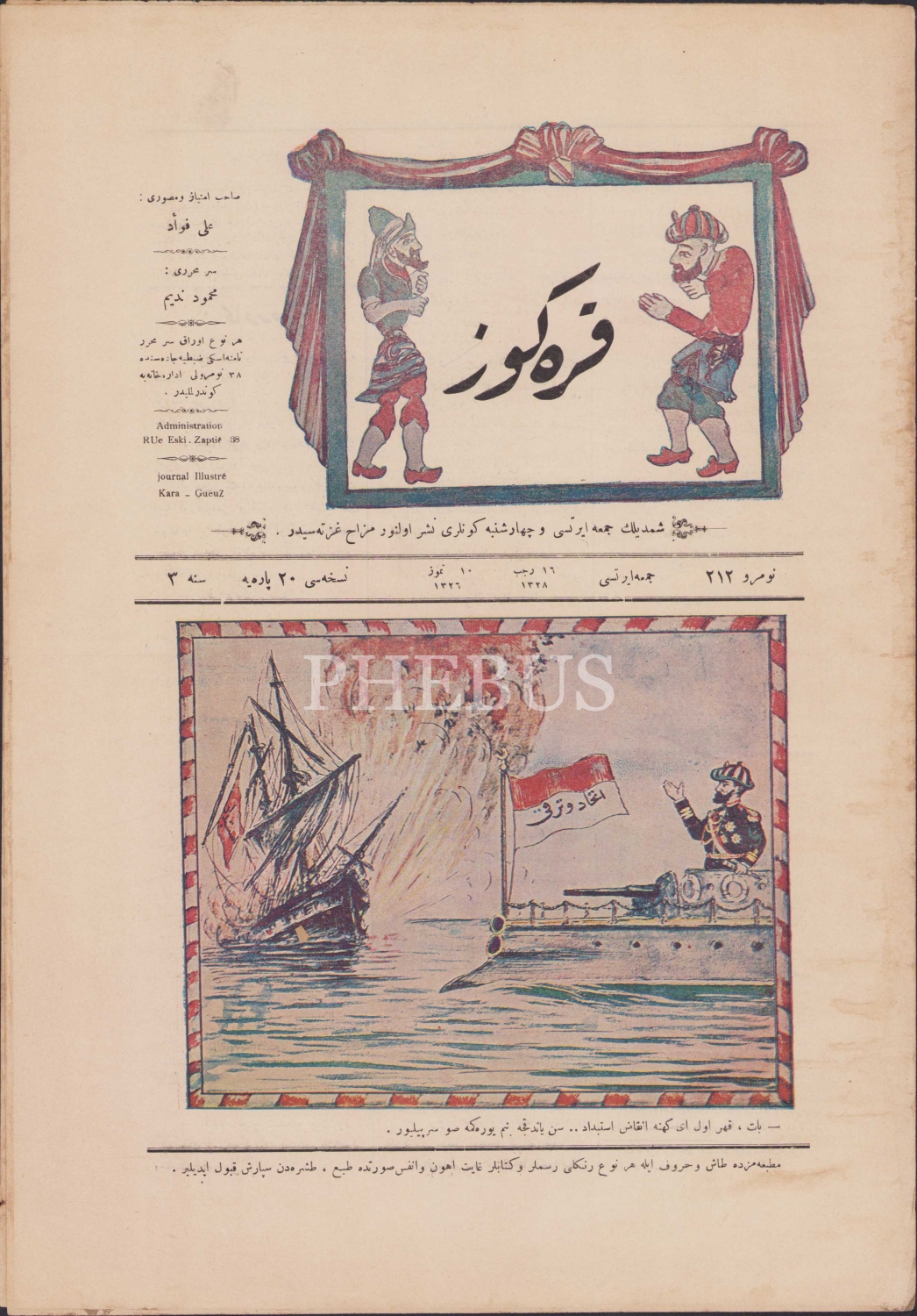 Osmanlıca Karagöz Mecmuası, Sene:3, 1 Temmuz 1328 tarihli, 212 Numara, 4 sayfa, 28x41 cm.