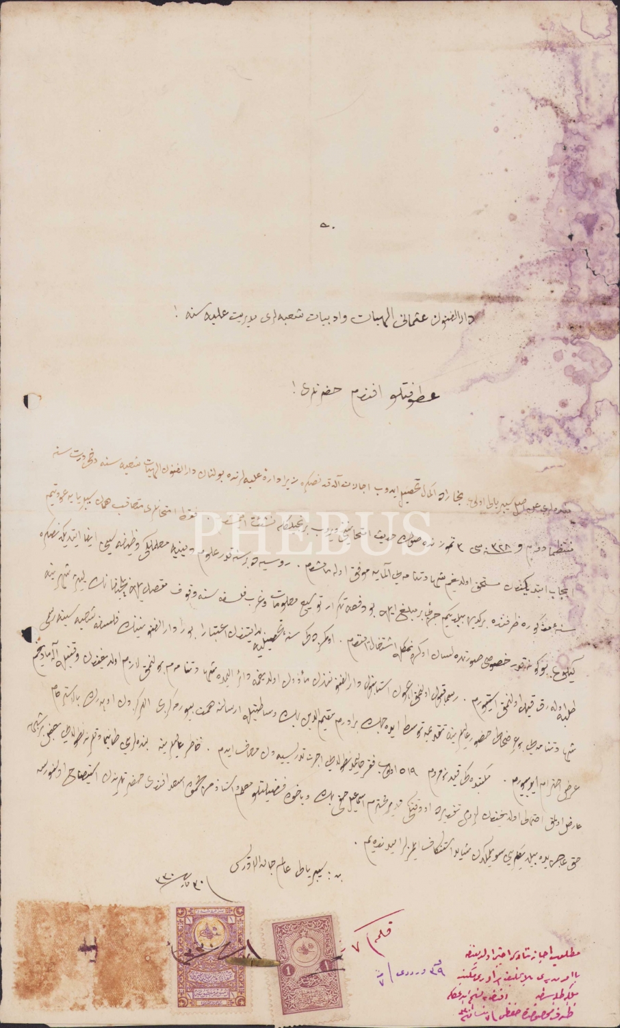 Darülfünun-ı Osmani İlahiyat ve Edebiyat Şubeleri Müdüriyetine yazılmış arzuhal, 1330 tarihli, haliyle, Osmanlıca, pullu, 2 sayfa, 20x36 cm.