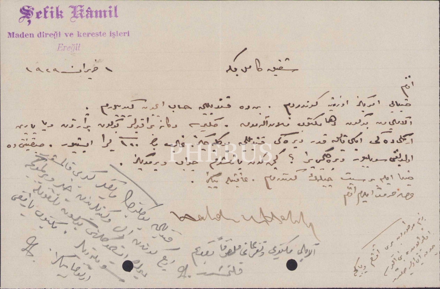 Şefik Kamil Maden Direği ve Kereste İşleri antetli kağıda Şefik Bey'e yazılmış Haziran 1929 tarihli Osmanlıca metin, 21x13 cm.