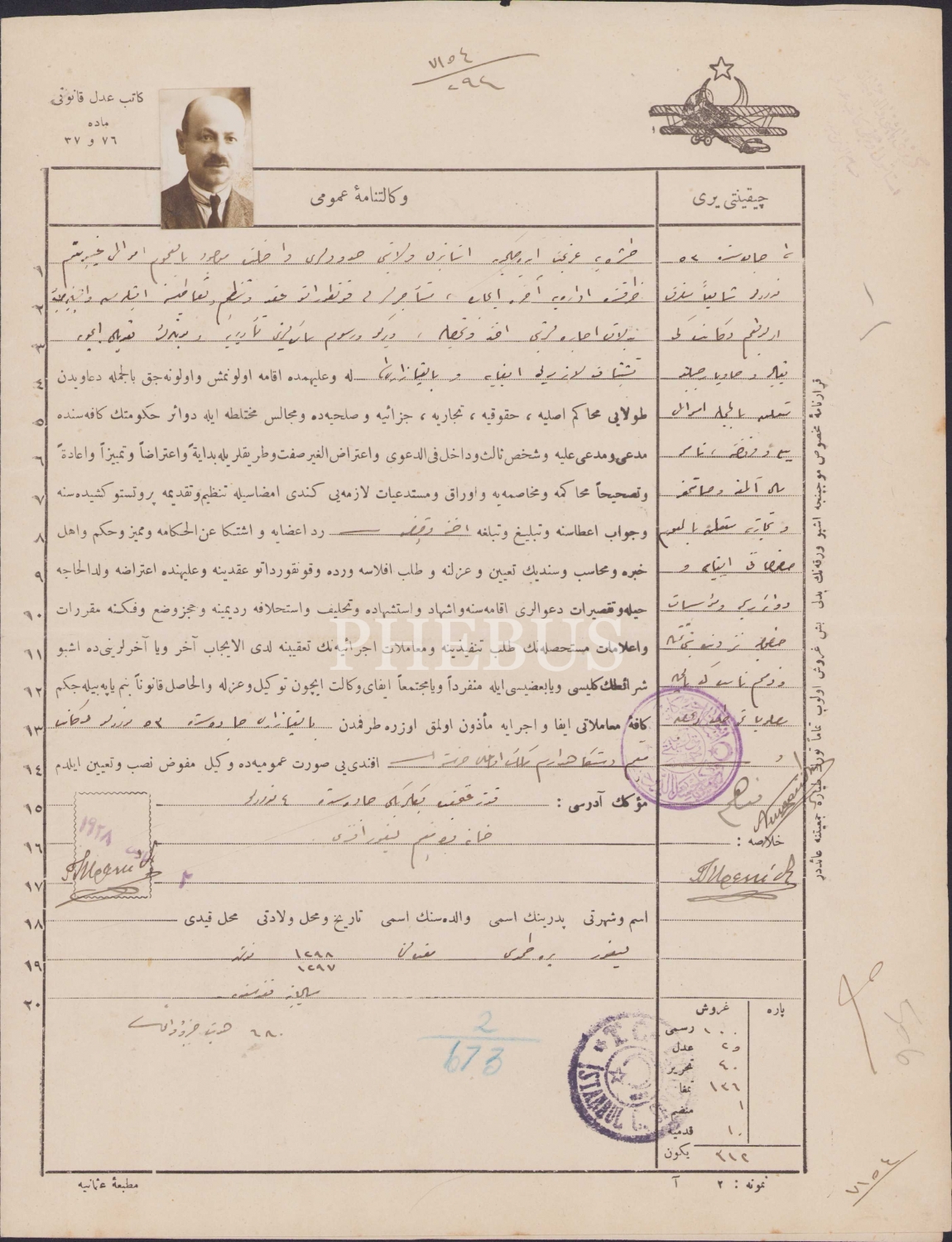 Türk Tayyare Cemiyeti görselli, Vekaletname-i Umumi, vesikalı, 1928 tarihli, 2 sayfa, 23x30 cm.