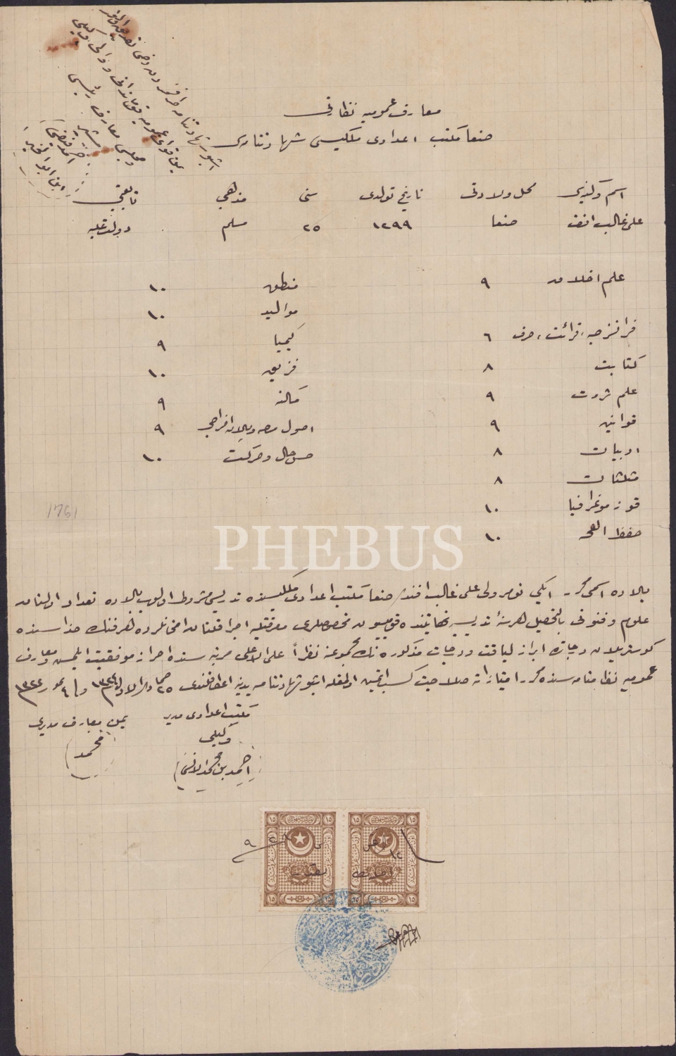 Maarif-i Umumiye Nezareti Sna'a Mekteb-i İdadi-i Mülkiyesi Diploması, el yazısıyla, damgalı ve pullu, 1322 tarihli, 20,5x32 cm.