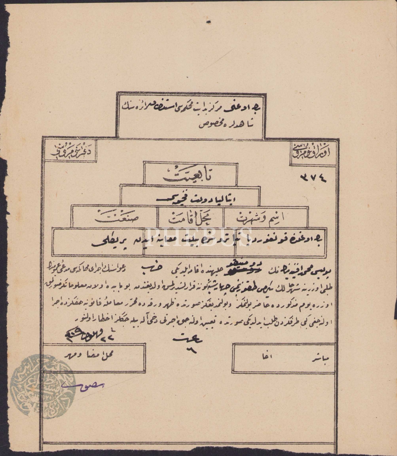 Beyoğlu Merkez-i Bidayet Mahkemesi İstanbul Dairesinin Şahitlerine Mahsus Osmanlıca, 1309 tarihli, damgalı, 16x18 cm.