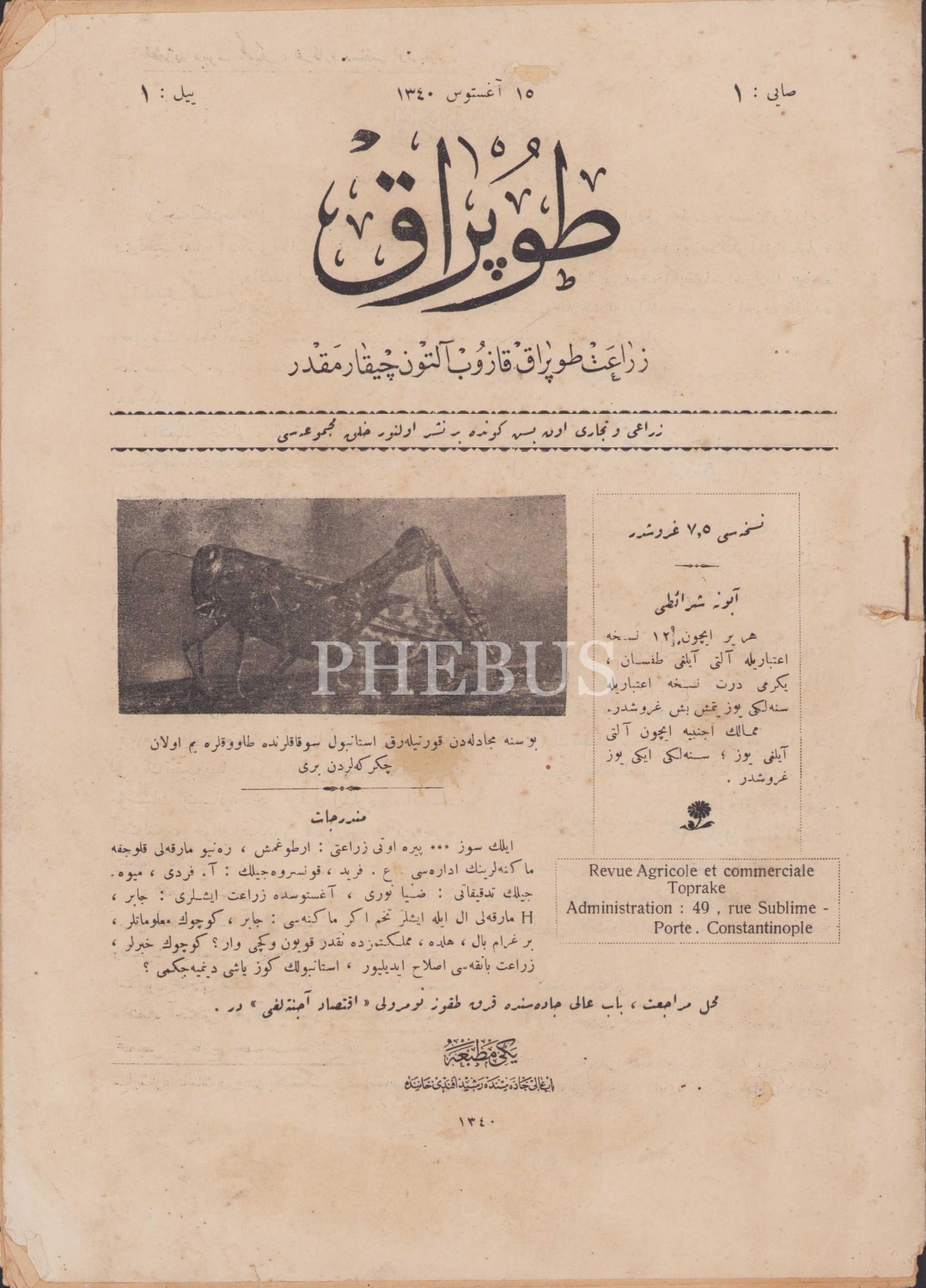 Osmanlıca Toprak Mecmuası'nın İlk Sayısı, Yıl:1, Sayı:1, 15 Ağustos 1340 tarihli, Yeni Matbaa, 18 sayfa, 20x28 cm.