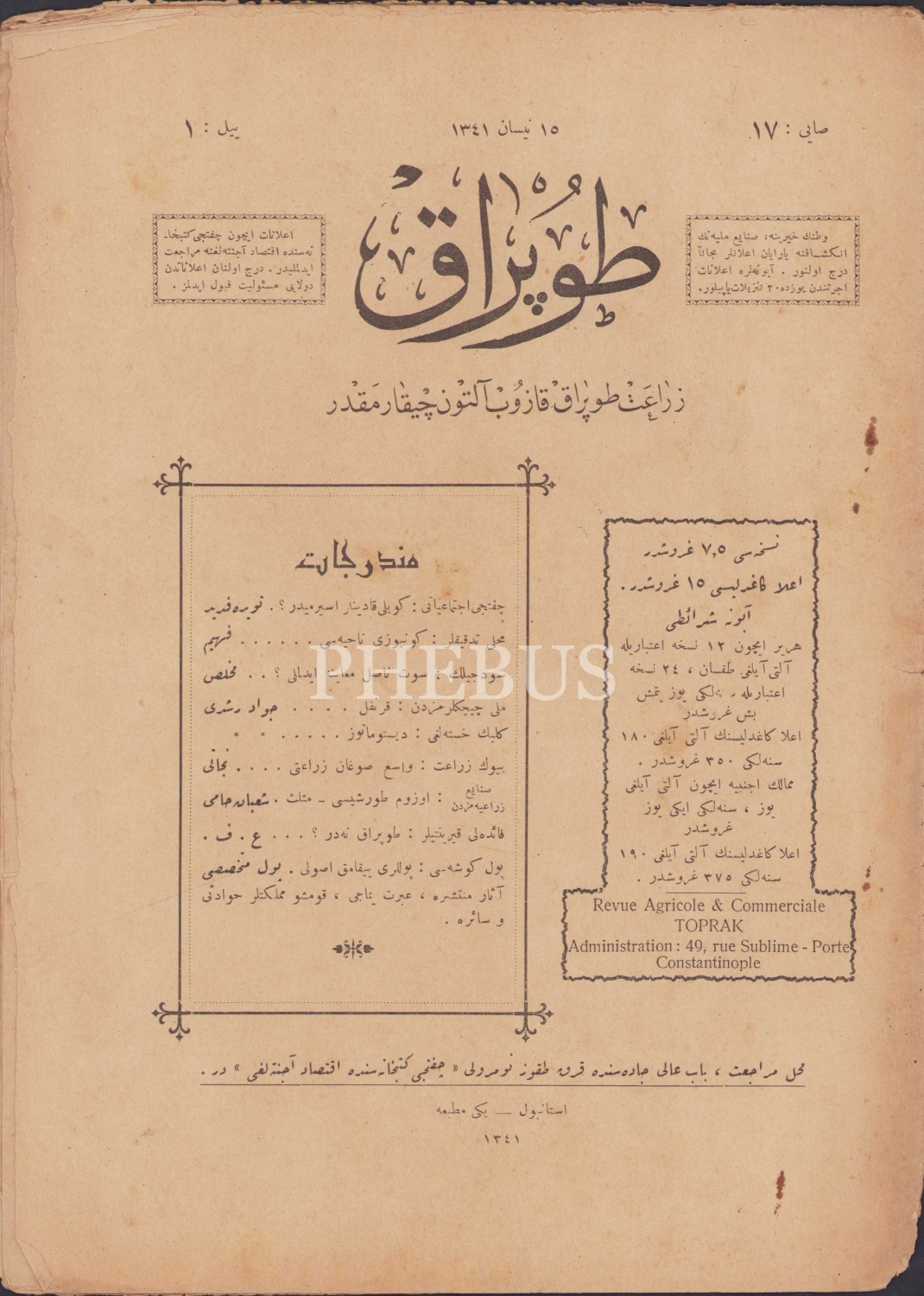 Osmanlıca Toprak Mecmuası, Yıl:1, Sayı:17, 15 Nisan 1341 tarihli, 20 sayfa, 20x28 cm.