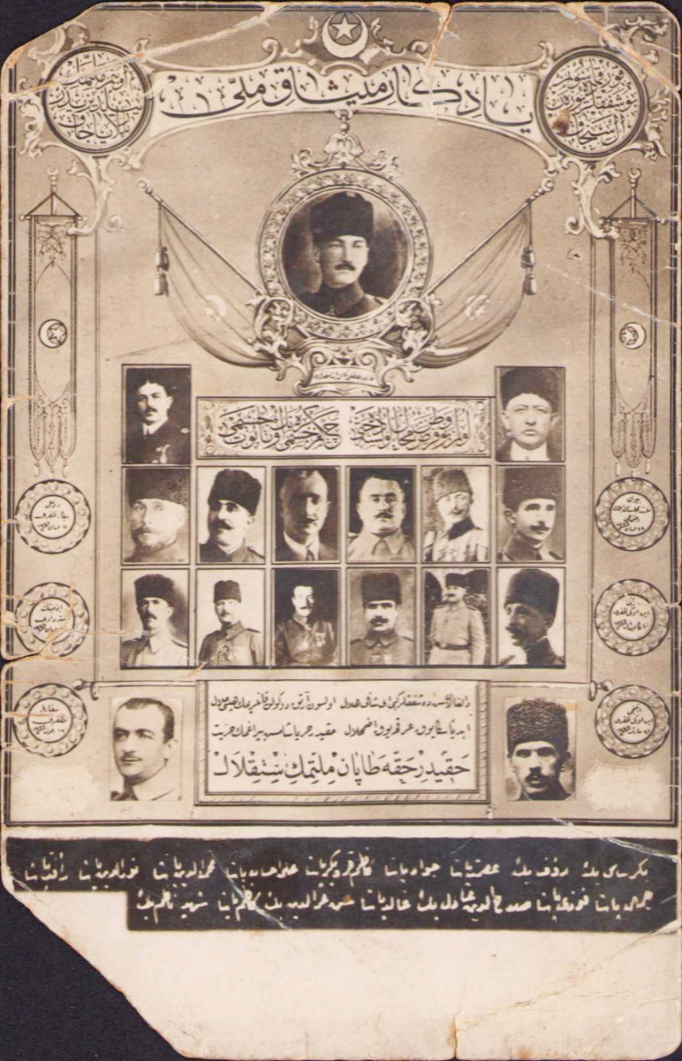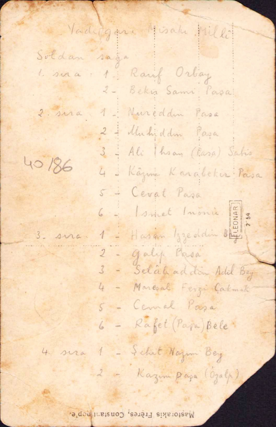 Atatürk ve paşaların olduğu Misakı Milli hatıra kartı, arkası fotoğraf listesi detaylı, Mastoraki Freres, Constantinople, haliyle