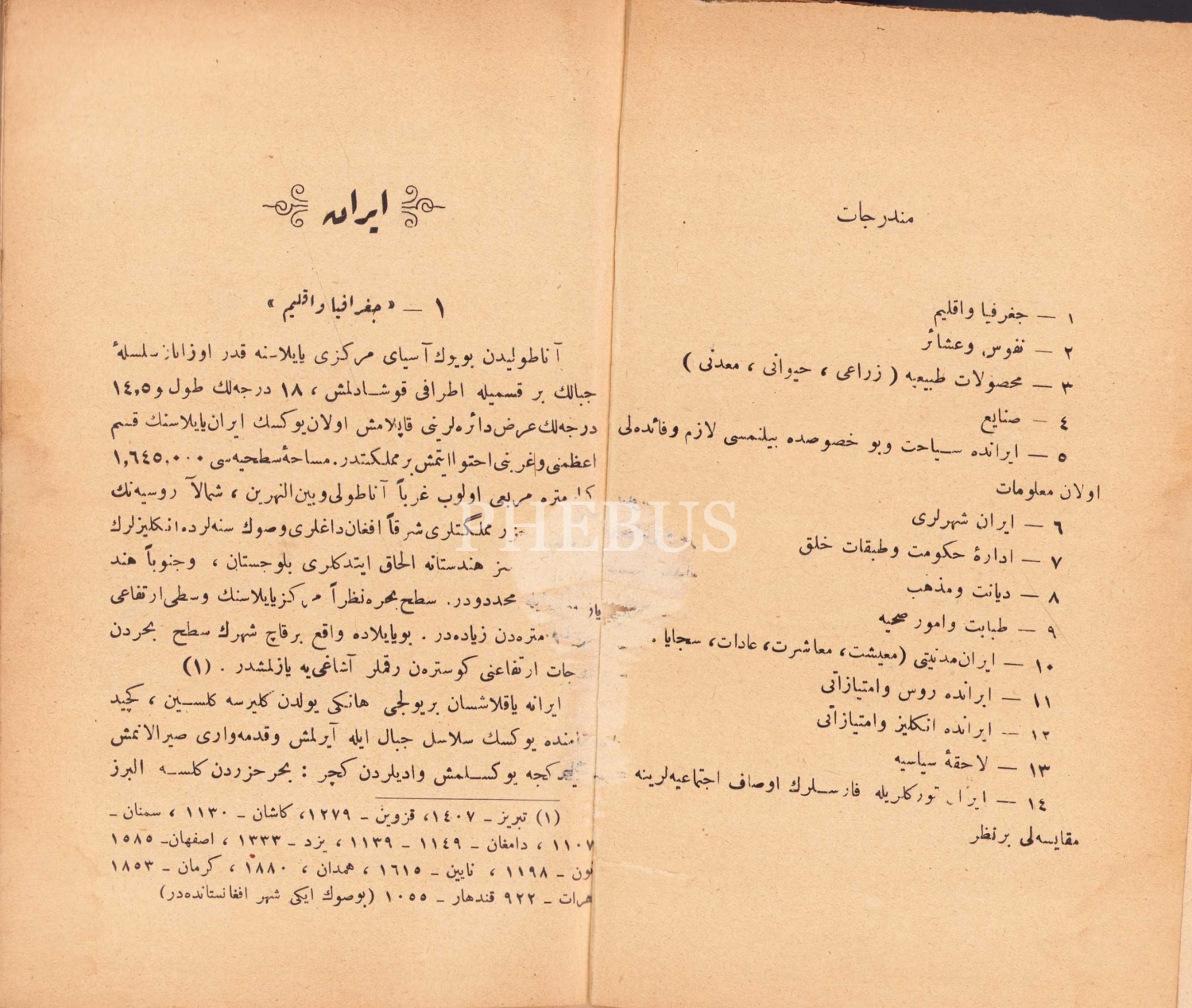 Osmanlıca İran - İklim, Halk, İktisadiyat, İçtimaiyat, Müessesât-ı Medeniye, Adât-ı Mülkiye vesaire Gibi Evsaf ve Hususattan Bahistir, Fahreddin Şevket, Karabet Matbaası, İstanbul, 1341