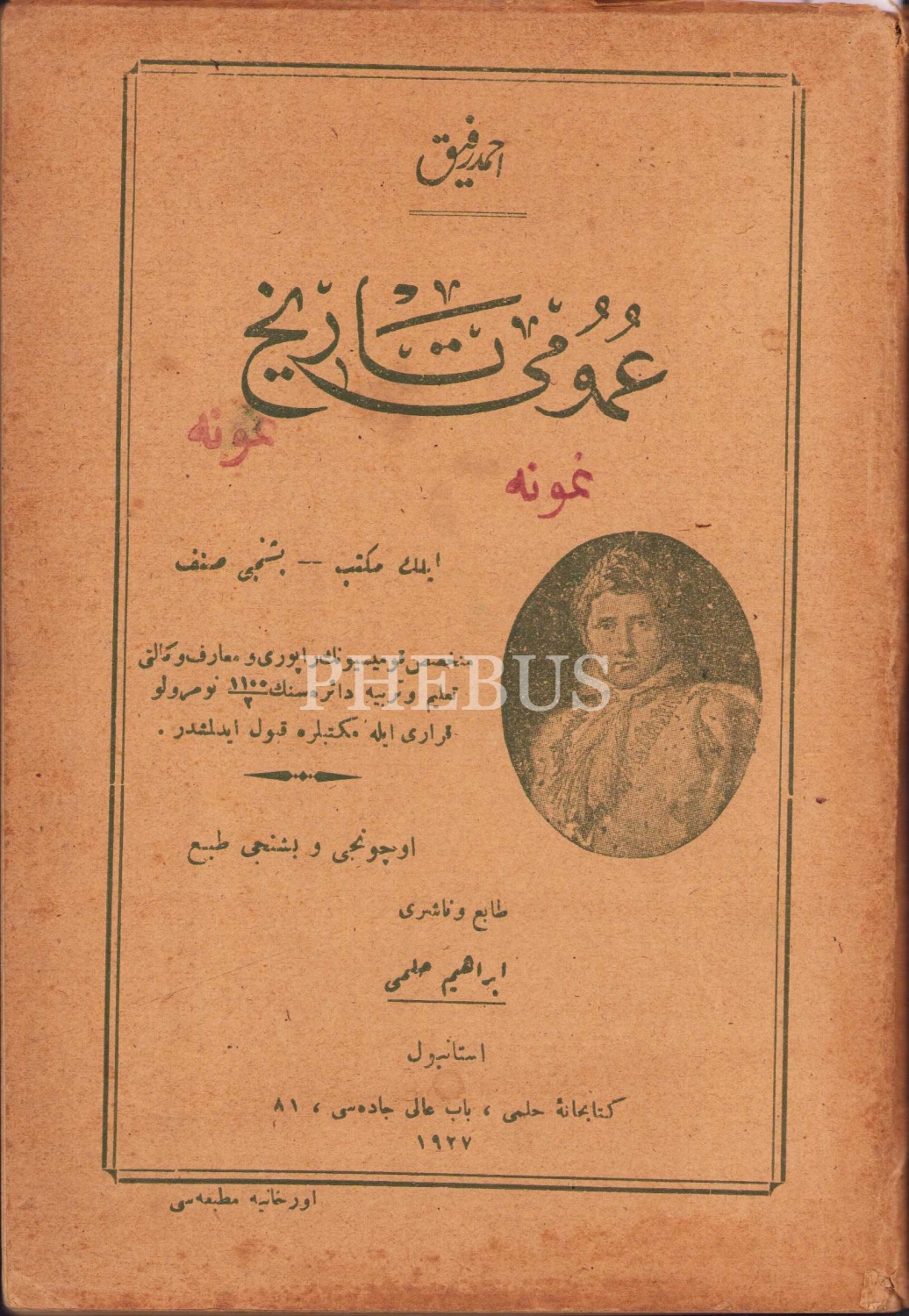 Osmanlıca Umumi Tarih - İlk Mektep Beşinci Sınıf, Ahmed Refik, üçüncü ve beşinci baskı,Orhaniye Matbaası, İstanbul, 1927, resimli, 193 sayfa, 13x19 cm