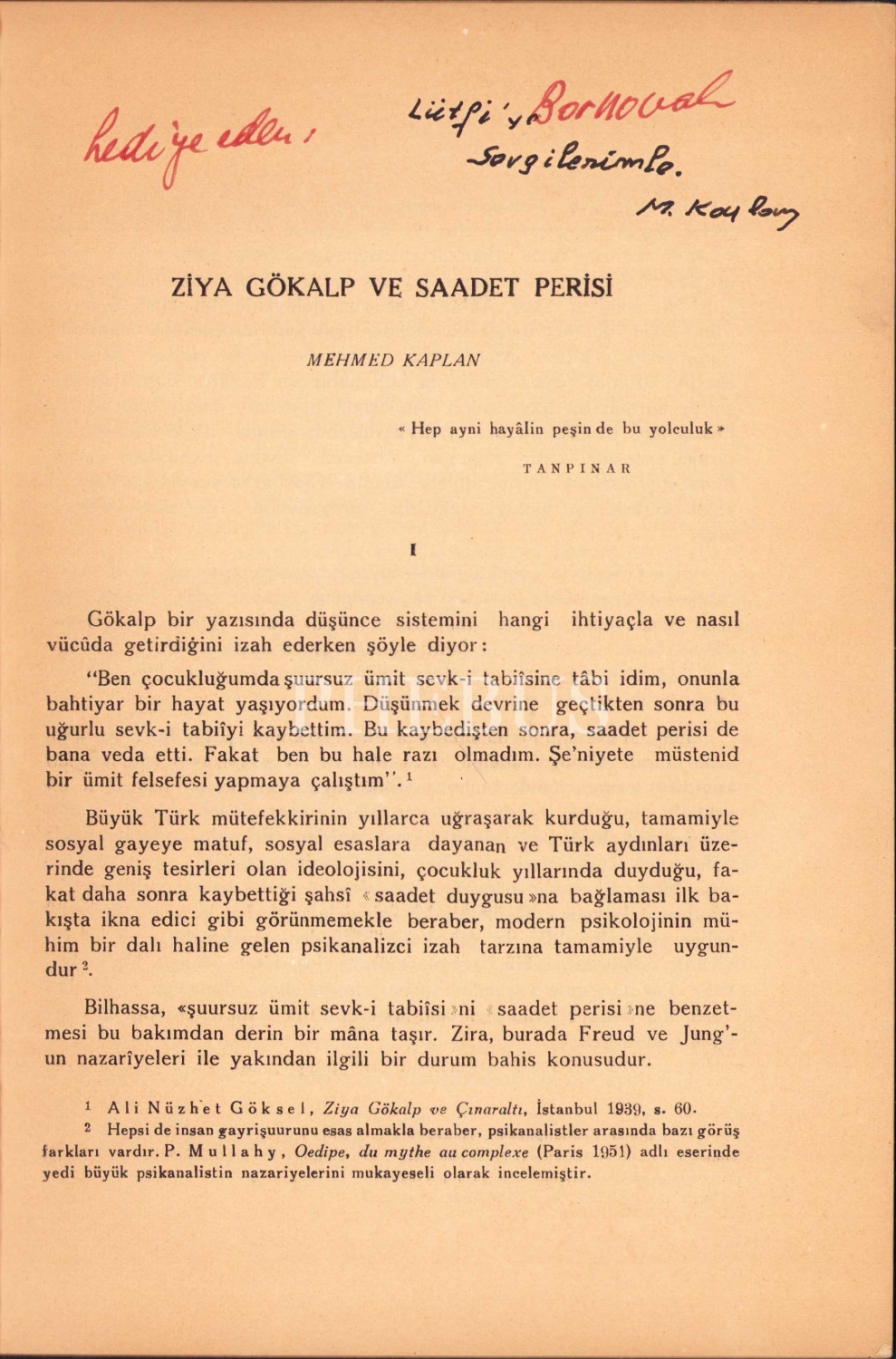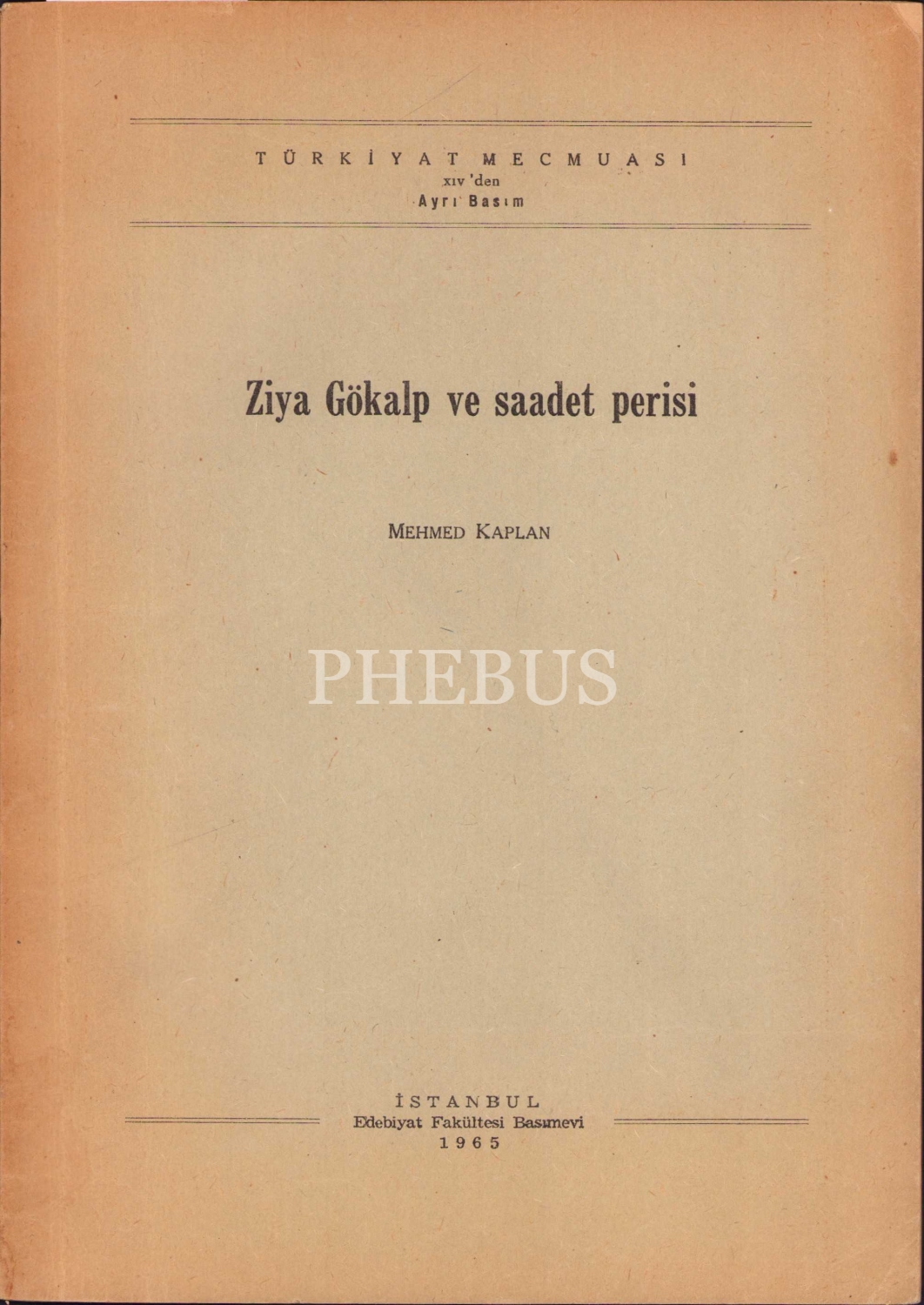 Ziya Gökalp ve Saadet Perisi, Mehmed Kaplan, İstanbul Edebiyat Fakültesi Basımevi, 1965, yazarından ithaflı, imzalı, 64 sayfa, 16x24 cm