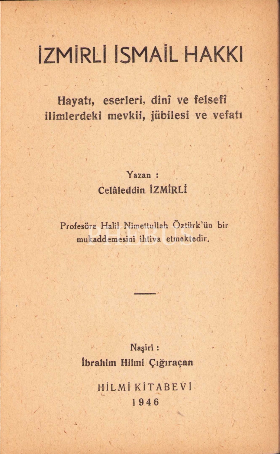İzmirli İsmail Hakkı - Hayatı, Eserleri, Dini ve Felsefi İlimlerde Mevkii, Celaleddin İzmirli, Hilmi Kitabevi,1946, ön kapak bir kenar yırtık, 47 sayfa, 11x18 cm