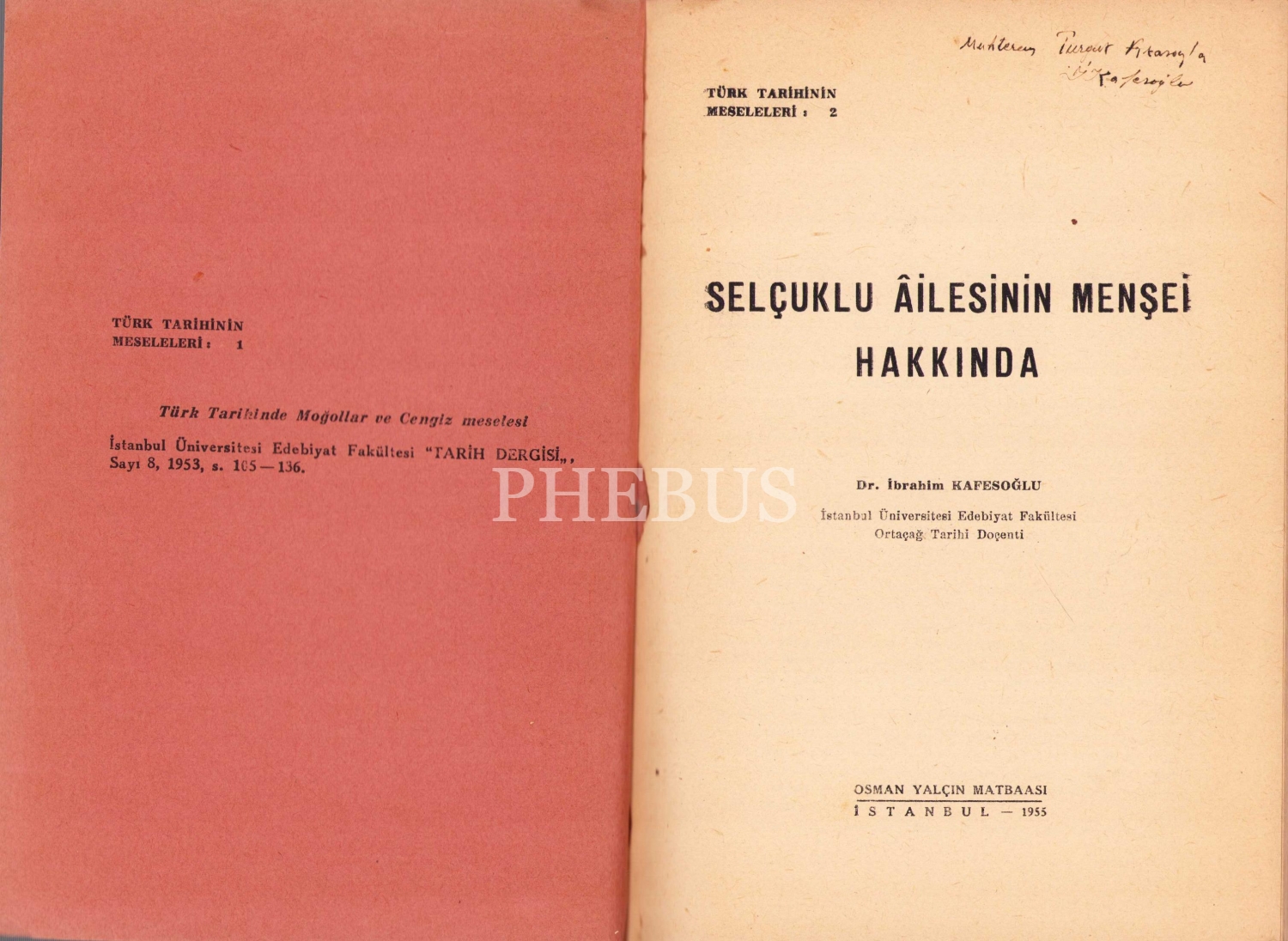 Selçuklu Ailesinin Menşei Hakkında, İbrahim Kafesoğlu, Osmani Yalçın Matbaası, İstanbul, 1955, yazarından ithaflı imzalı, sırtı su görmüş, 34 sayfa, 16x24 cm