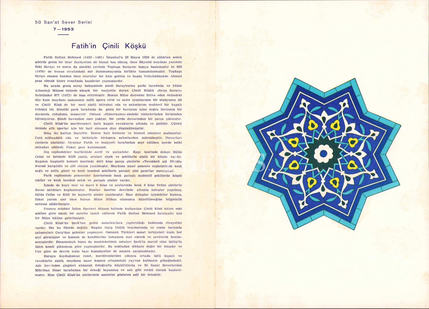 İstanbulun 500 üncü Çinili Köşk Tavan Göbeği, Süheyl Ünver, 50 Sanat Sever Serisi 7, İstanbul, 1953,16x24 cm