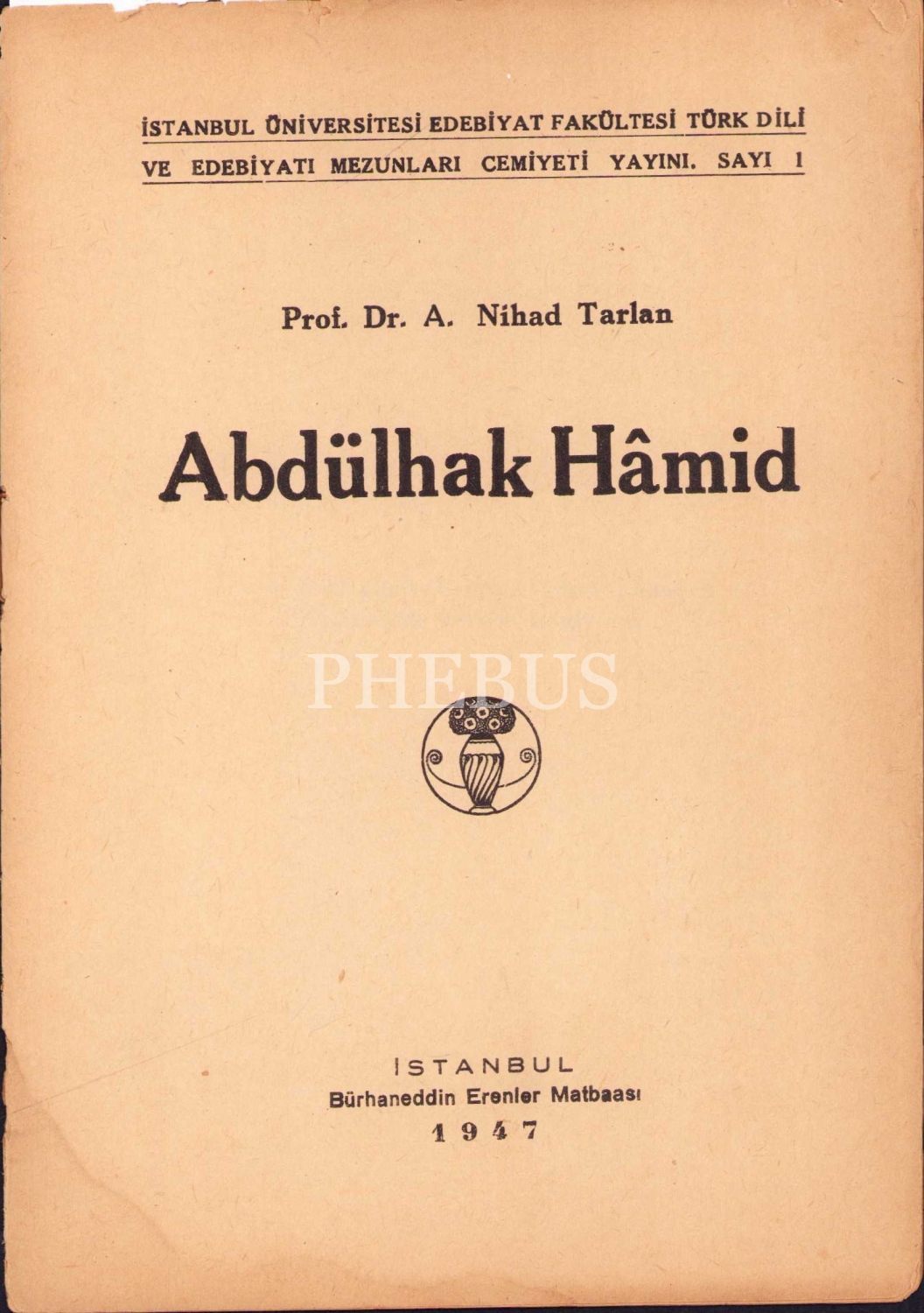 Abdülhak Hamid, Prof. Dr. Ali Nihad Tarlan, İstanbul Üniversitesi Edebiyat Fakültesi Mezunları Cemiyeti Yayını, Sayı:1, İstanbul, Burhaneddin Erenler Matbaası, 1947 tarihli, 15 sayfa, 14x19 cm