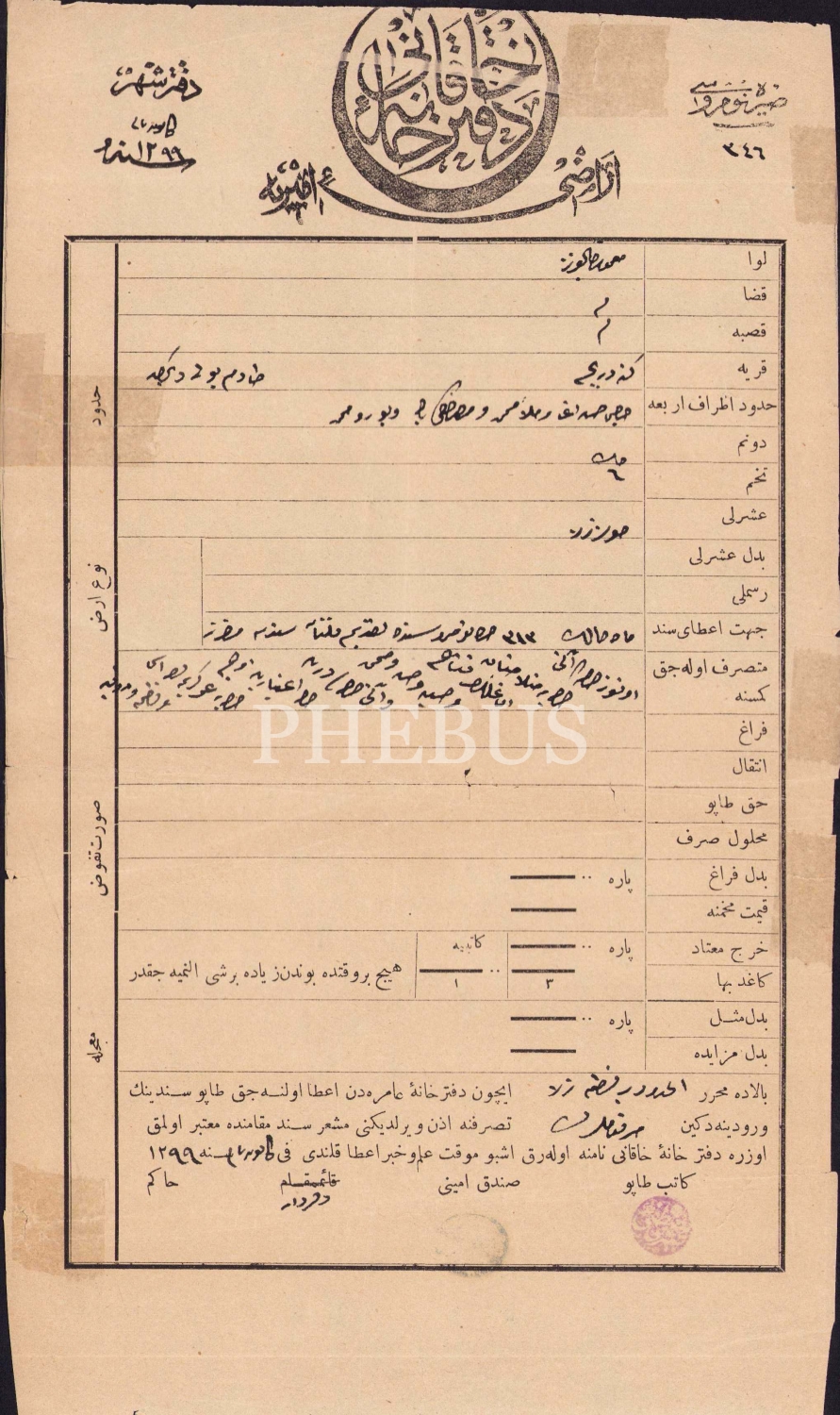 Defter-i Hakani antetli arazi tapusu, Mamuretü'l Aziz [Elazığ|], 1299 tarihli, Osmanlıca, 17x29 cm