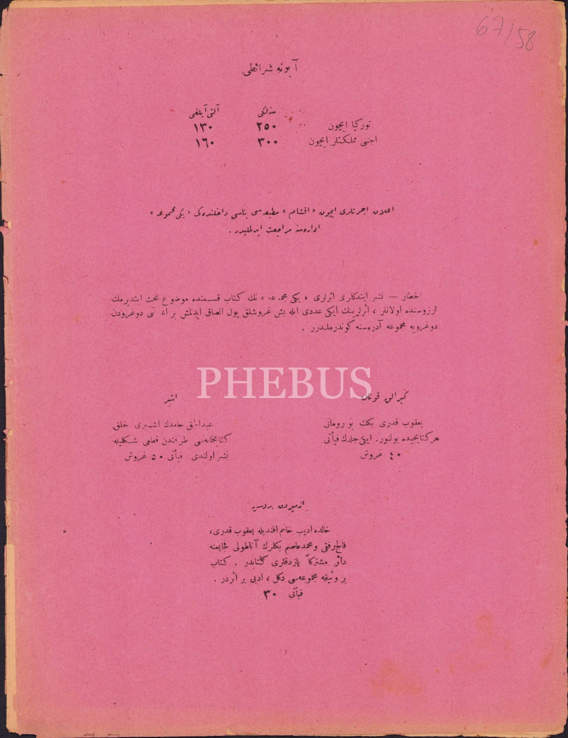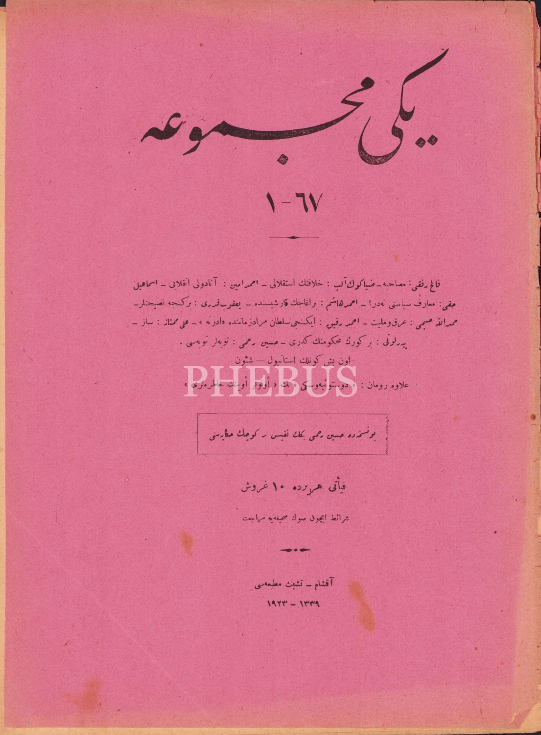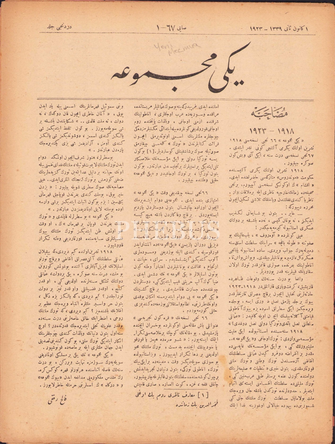 Yeni Mecmua, Sayı:1-67, Dördüncü Cild, Haliyle, Osmanlıca, 1 Kanunusani 1923 tarihli, 16 sayfa, 23x32 cm
