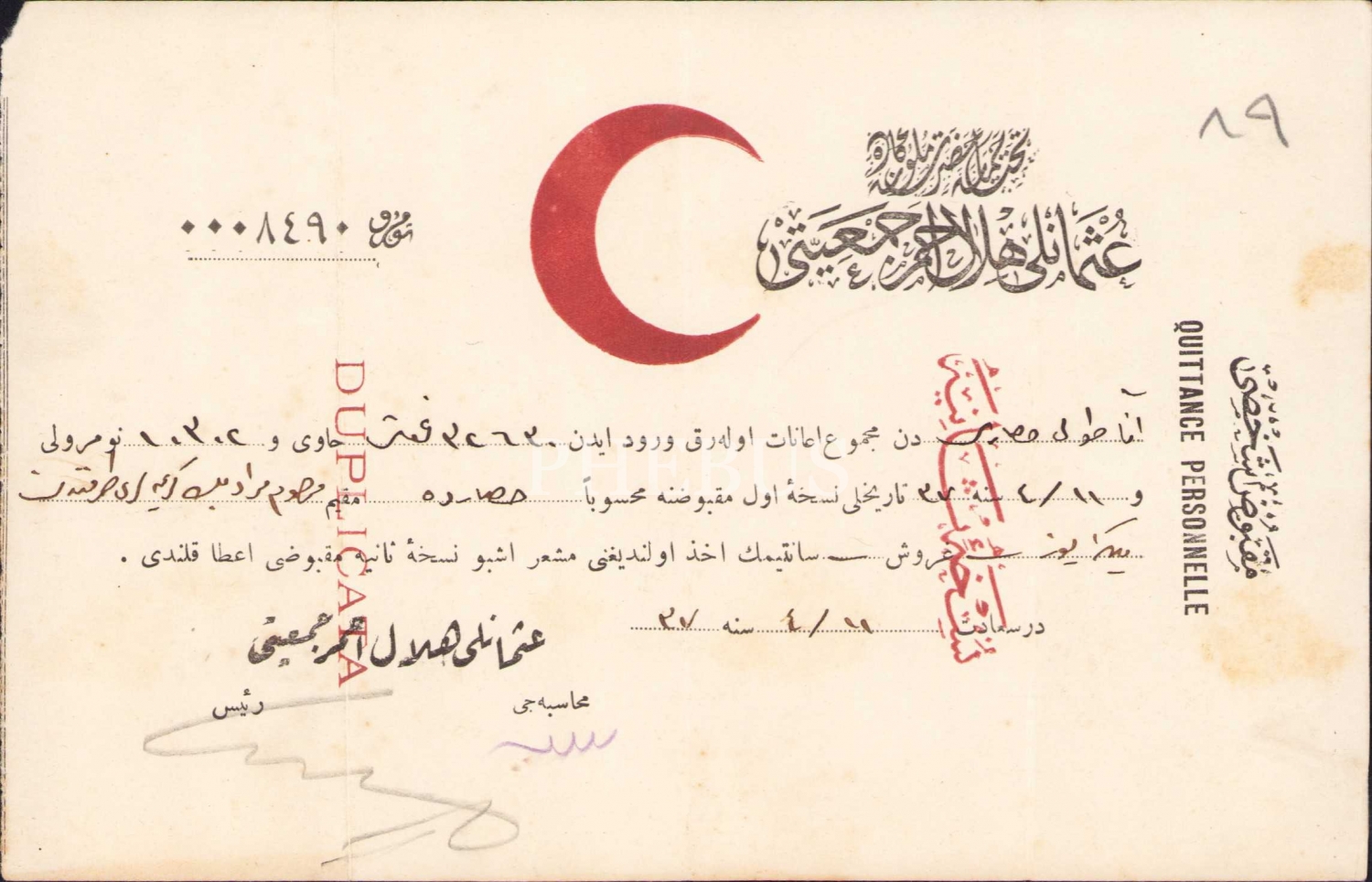 Osmanlı Hilal-i Ahmer Cemiyeti makbuz, 1337 tarihli, Osmanlıca, 19x12 cm