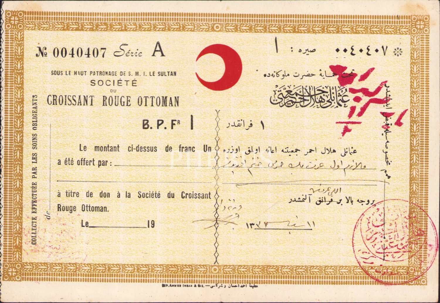 Osmanlı Hilal-i Ahmer Cemiyeti 1/2 yarım liralık, Osmanlıca ve Fransızca, 1327 tarihli, Osmanlı Hilal-i Ahmer Cemiyeti damgalı, 20x14 cm