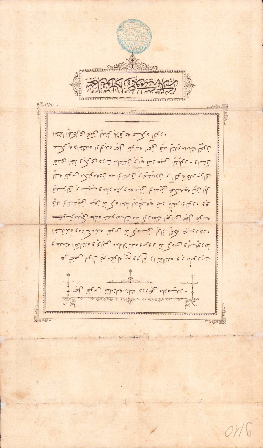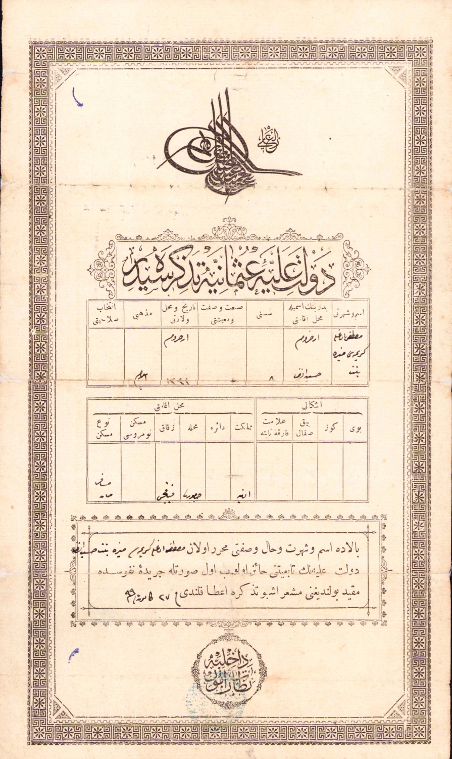 Osmanlı dönemi Erzurum'dan Ünye'ye olan seyehat tezkere belgesi, arkası sicili nüfus nizamnamesinin dördüncü maddesi yazılı Osmanlıca belge, 18x30cm