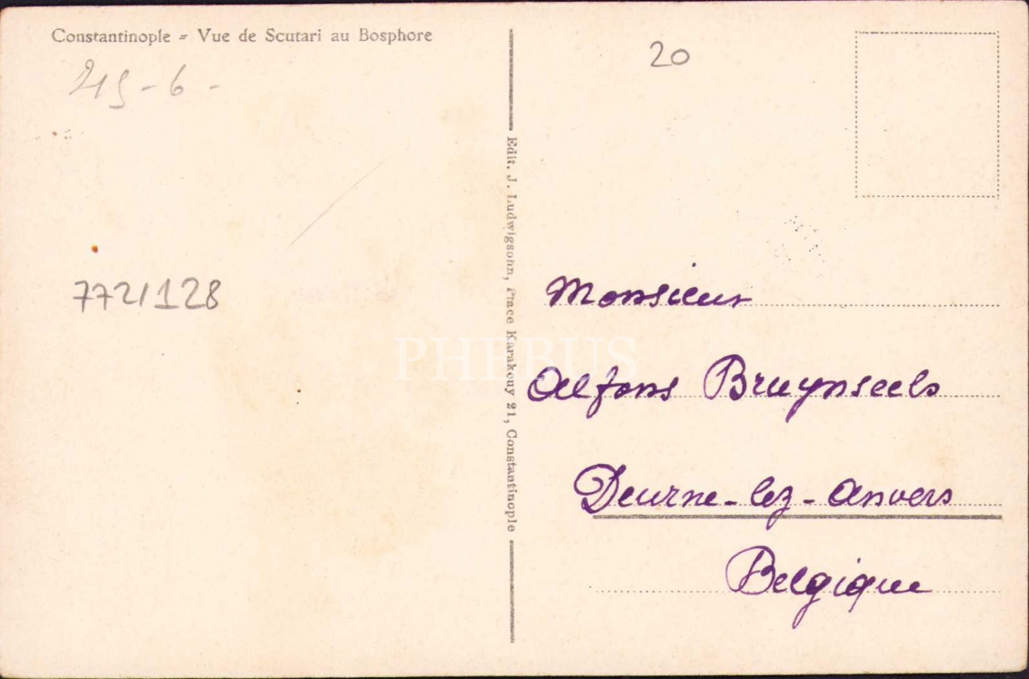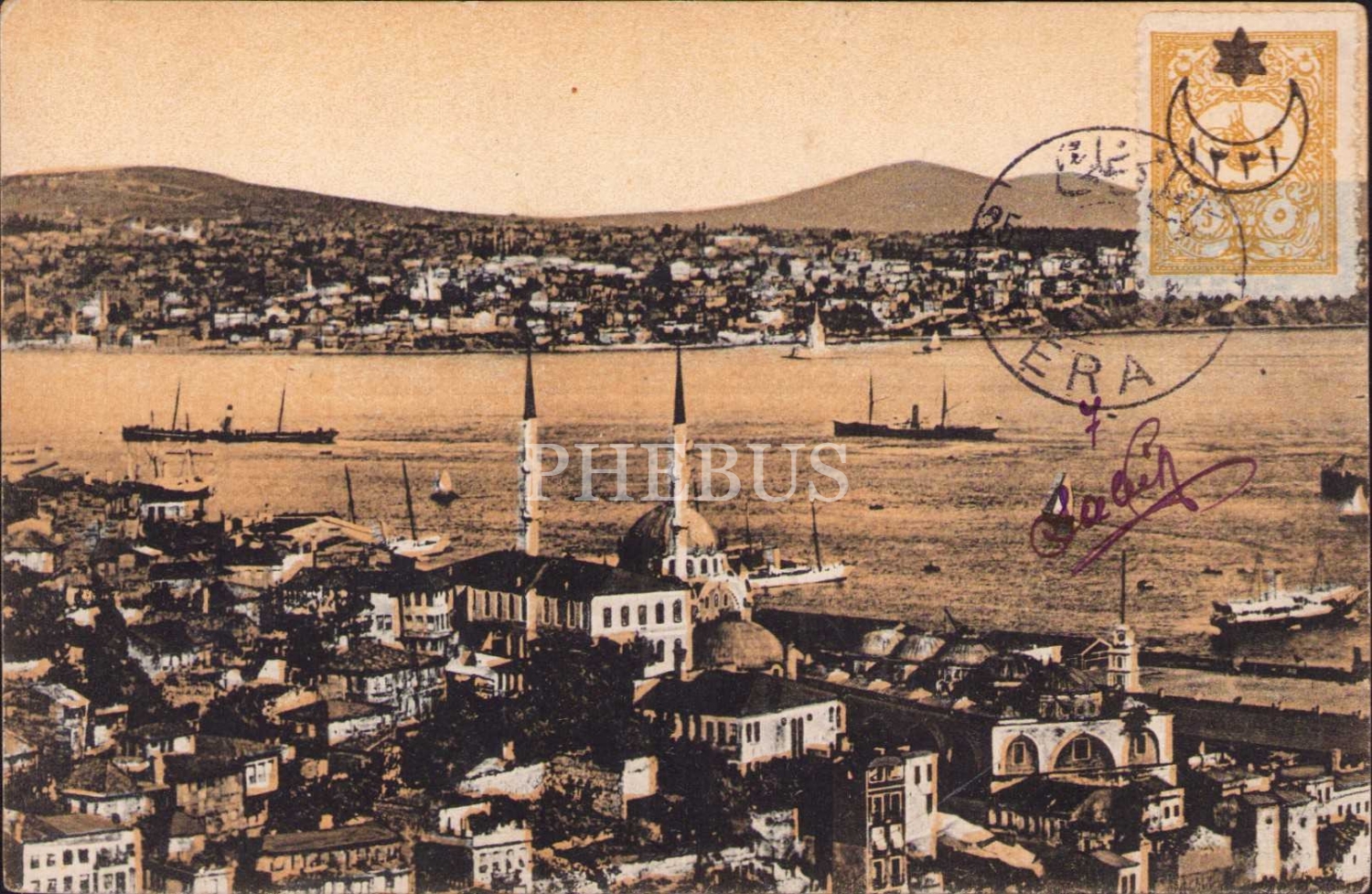 Osmanlı dönemi Boğazdan Üsküdar görünümü, postadan geçmiş önden Pera damgalı, editör J. Ludwigsohn