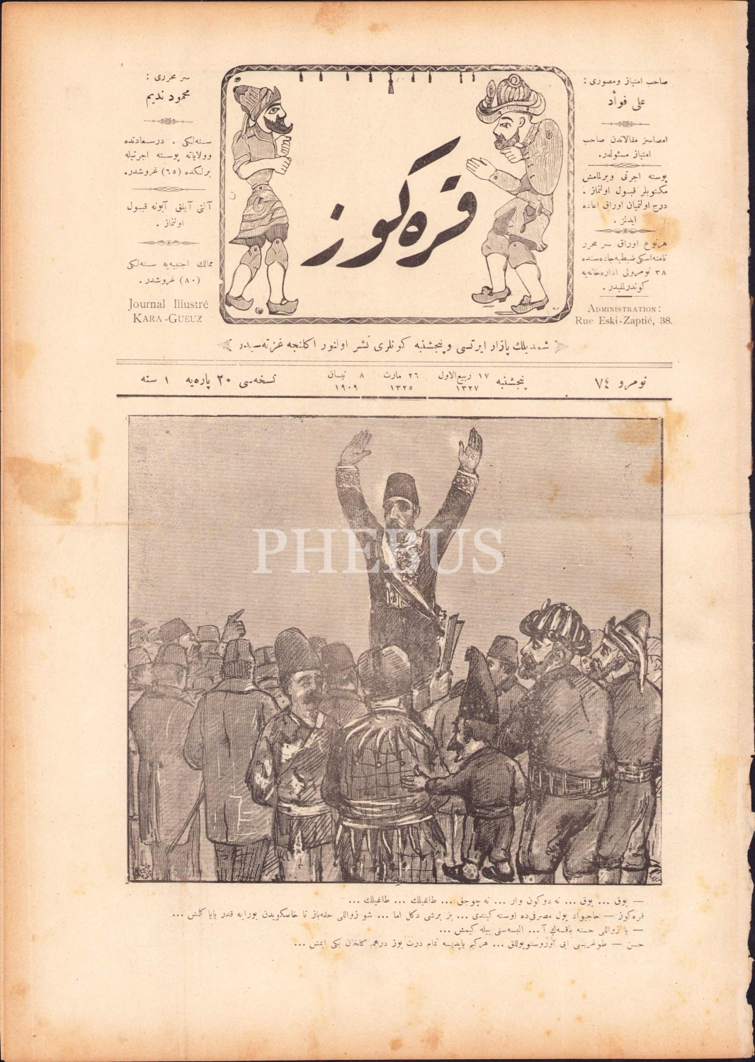 Osmanlı dönemi Karagöz mizah gazetesi, 1909, 4 sayfa, 28x40 cm