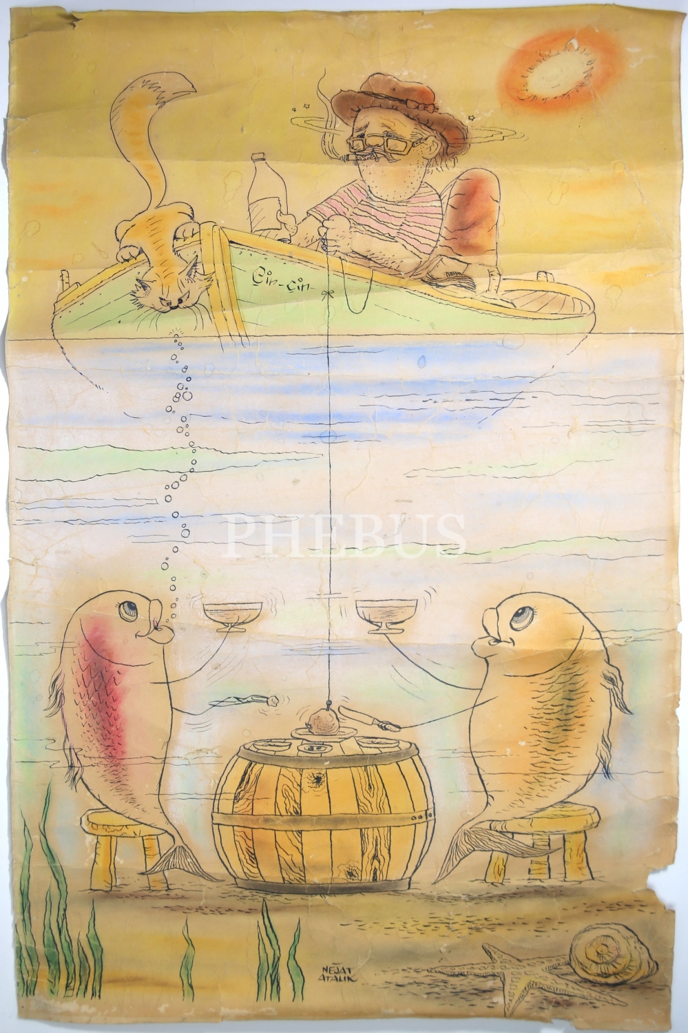 Nejat Atalık ıslak imzalı karikatür, yıpranmış haliyle, 43x58 cm