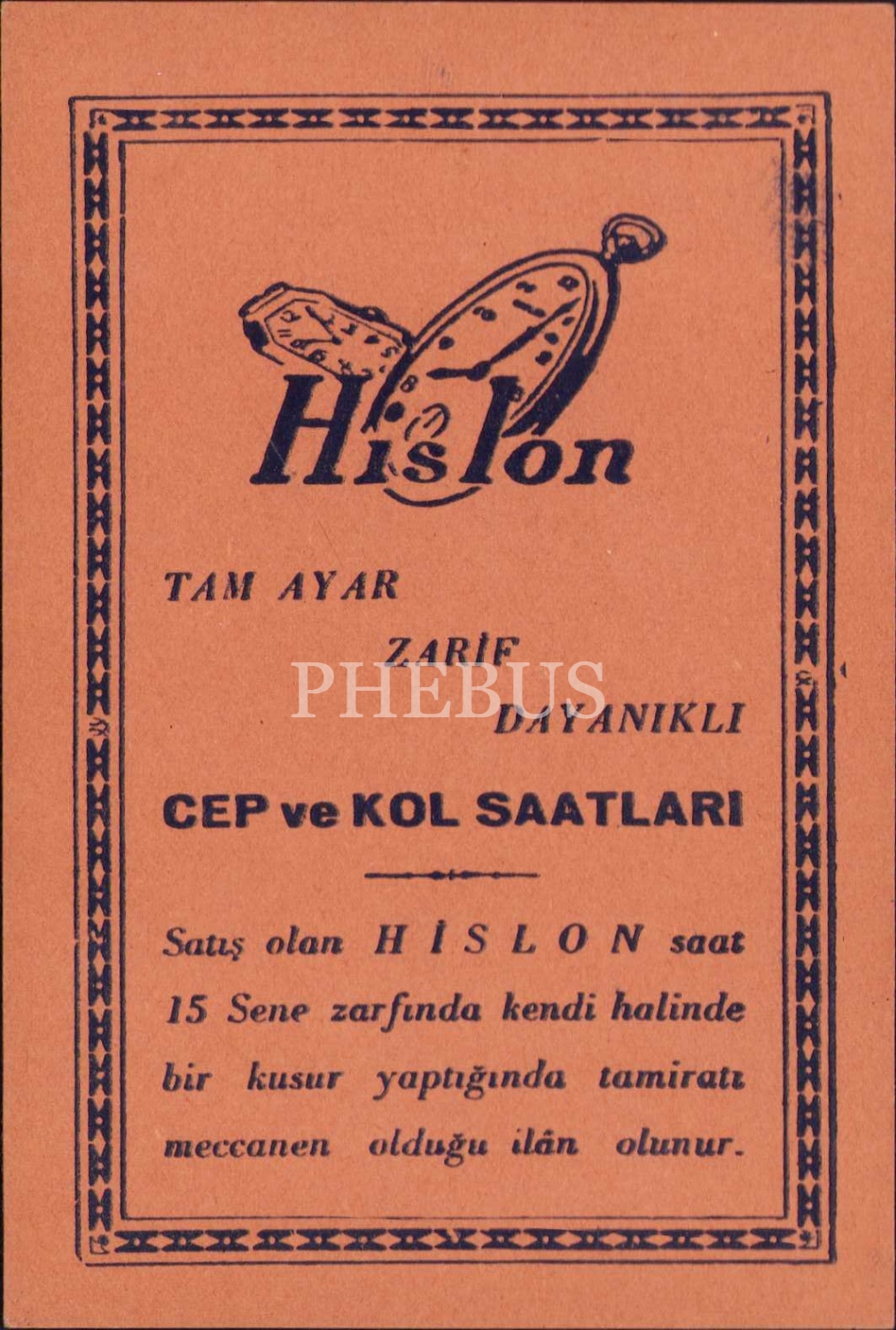 Hislon Cep ve Kol Saatleri reklam kartı, arkası damga pullu, 9x13 cm