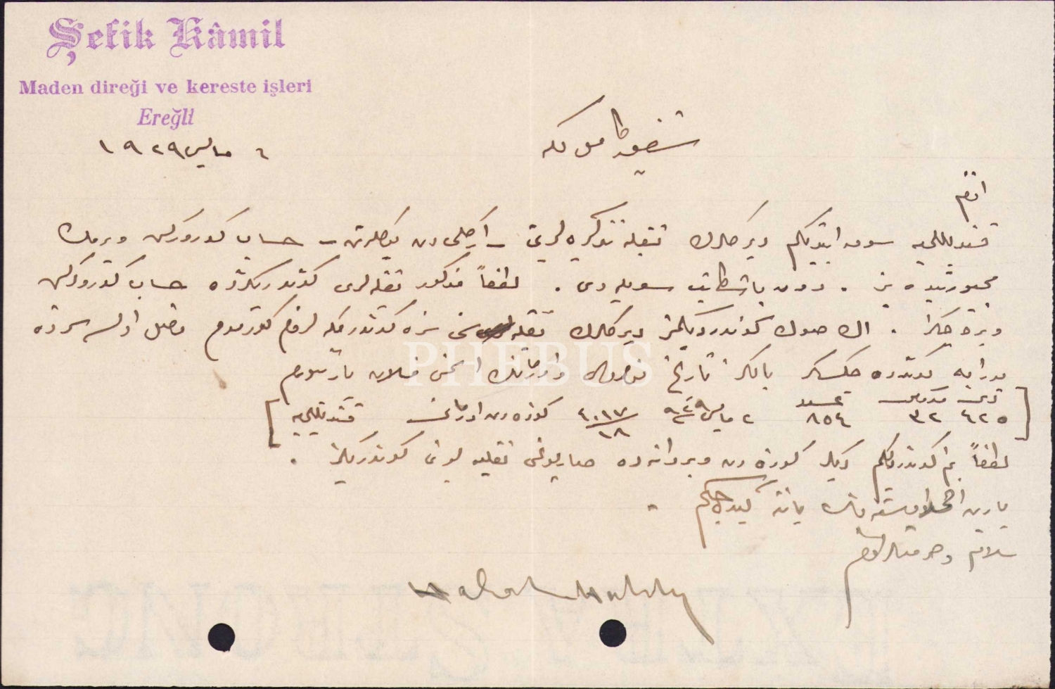 Konya Ereğli Şefik Kamil antetli, Osmanlıca yazılı döküman, 20x13 cm