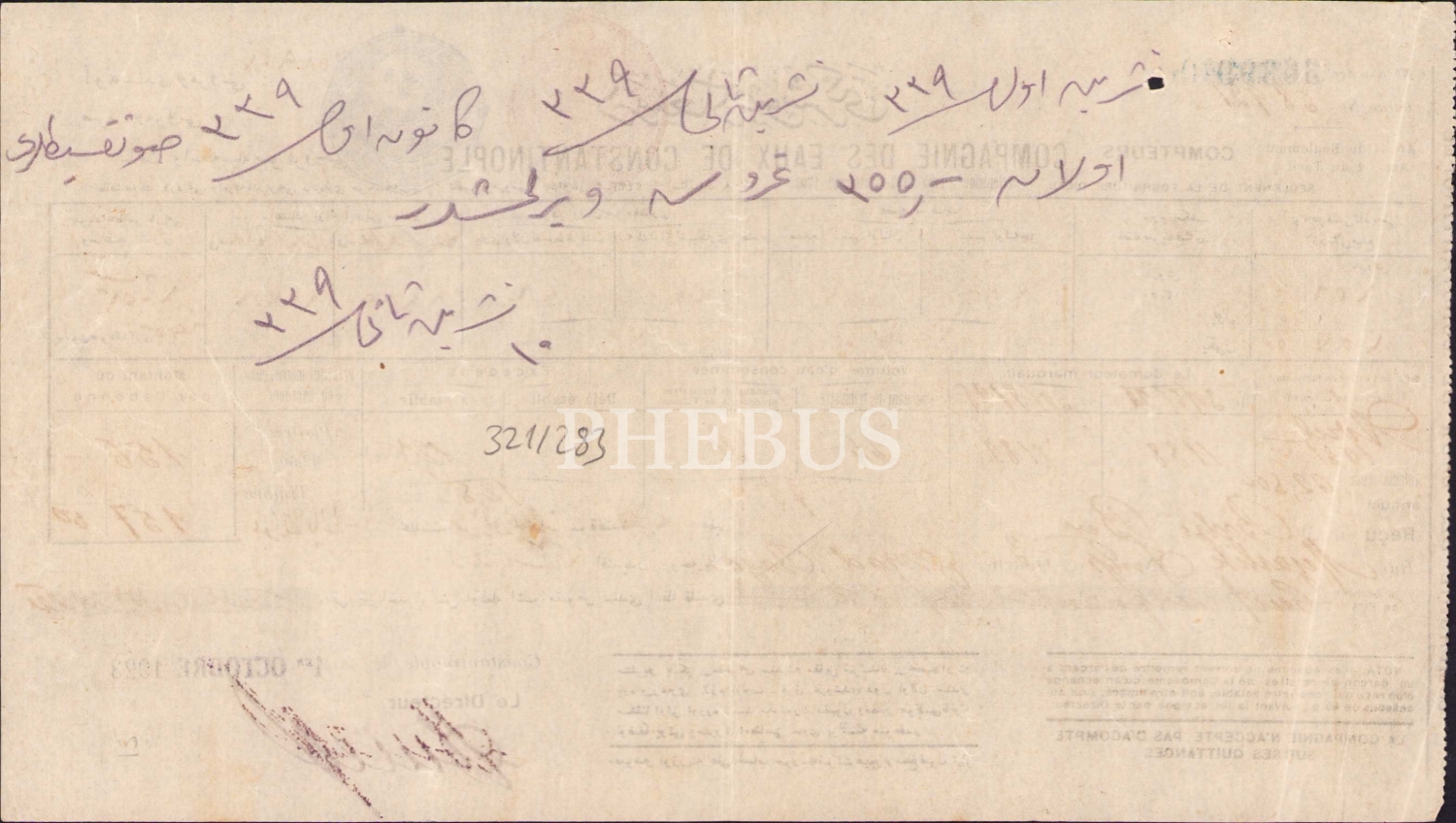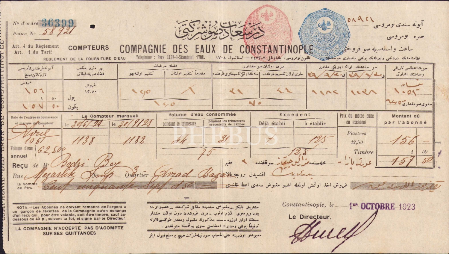 Osmanlı Dersaadet Su Şirketi fatura, Osmanlıca - Fransızca iki dilde, 1923, Osmanlıca damgalı, 25x14 cm