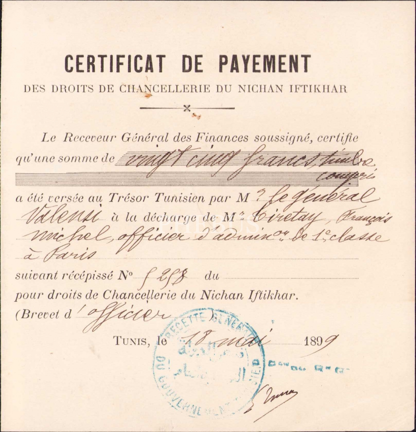 Fransızca iftihar belgesi, 1899, 13x13 cm