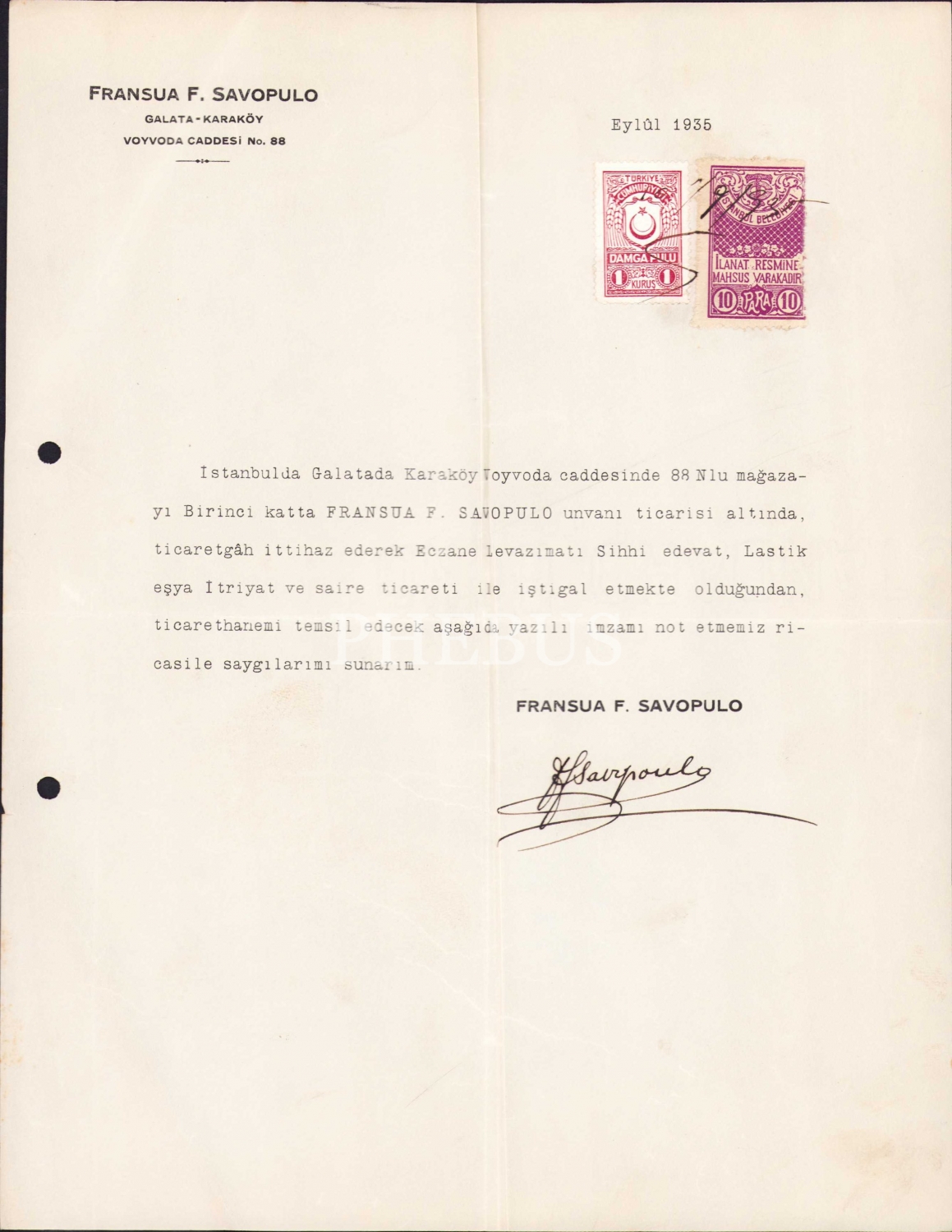 Fransua F. Savopulo Galata - Kadıköy antetli doküman, 1935, 20x28 cm