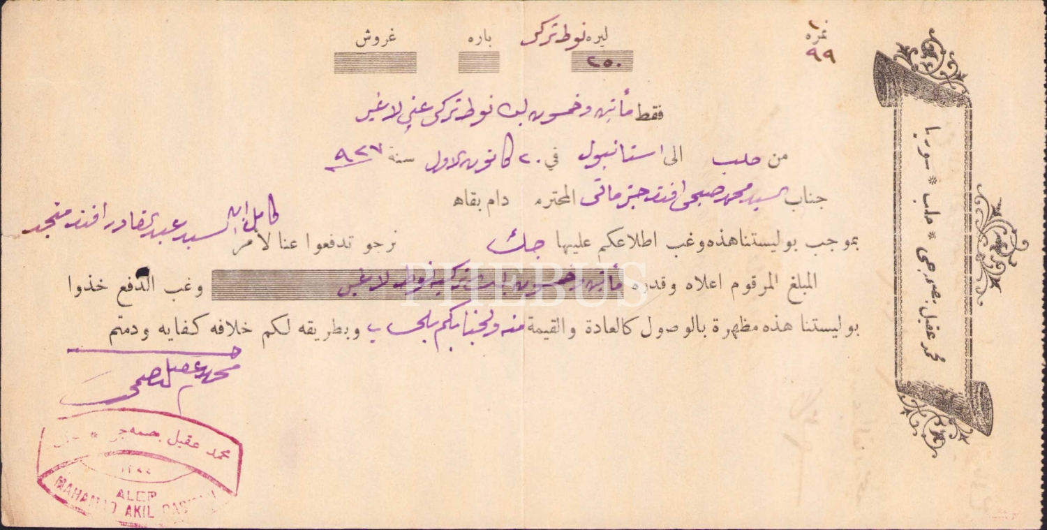 Arapça Muhammed Akil Basmacı - Halep Suriye antetli makbuz, 1927, 20x11 cm
