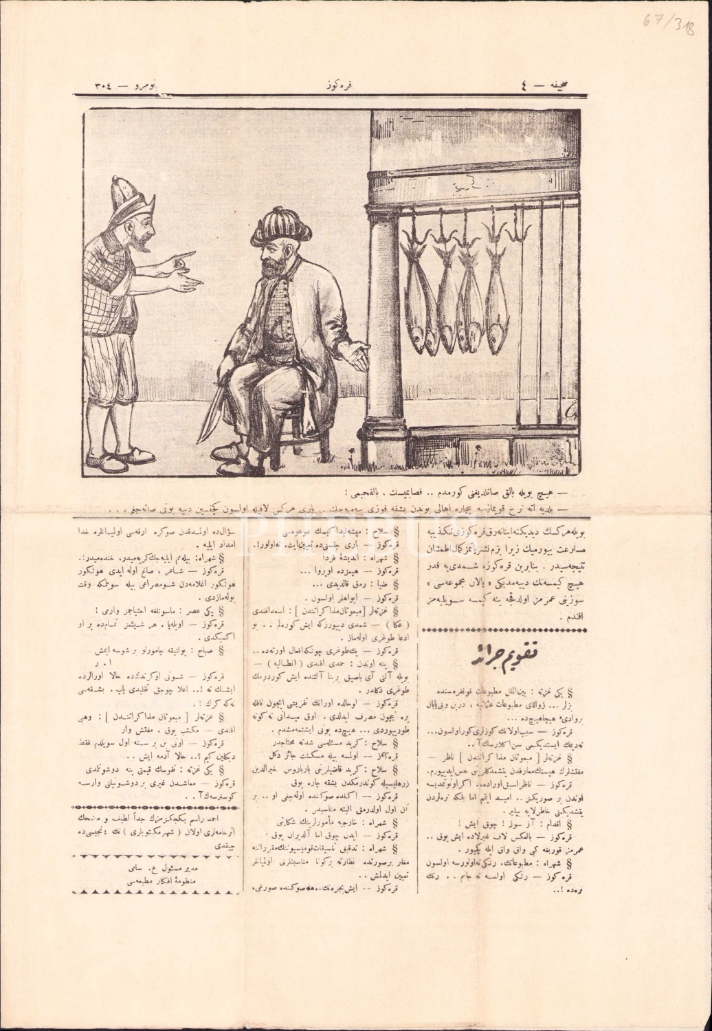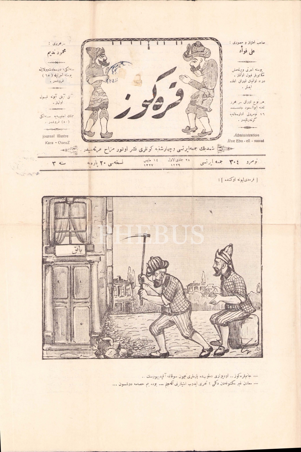 Osmanlıca Karagöz mizah gazetesi, muharriri Mehmed Nedim, 1327, 4 sayfa, 28x40 cm