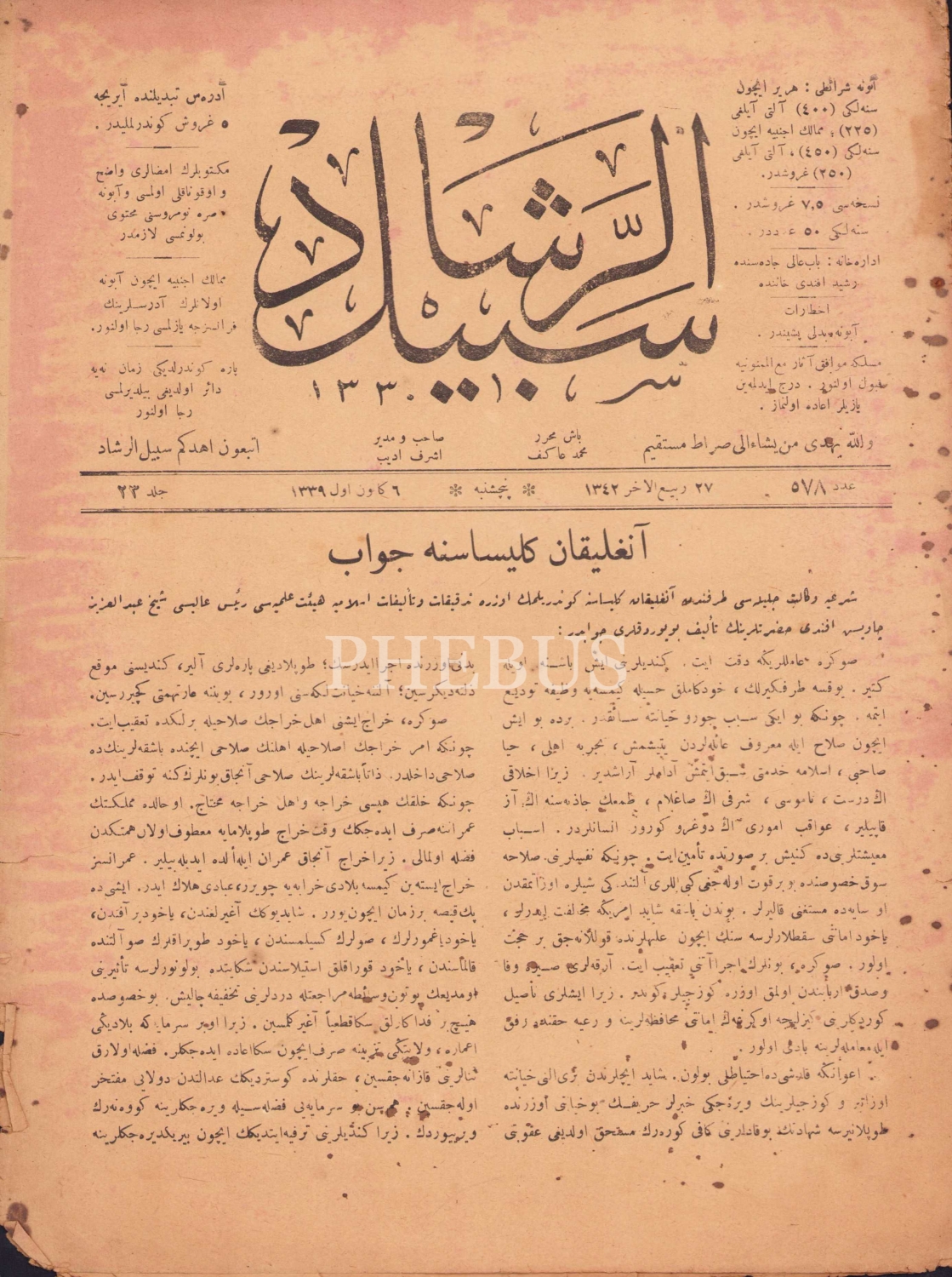 Osmanlıca Sebilürreşad mecmuası, 1339, baş muharriri Mehmed Akif, sahibi Eşref Edip, "Angalikan Kilisesine Cevap", sırtı haliyle, 14 sayfa, 23x30 cm