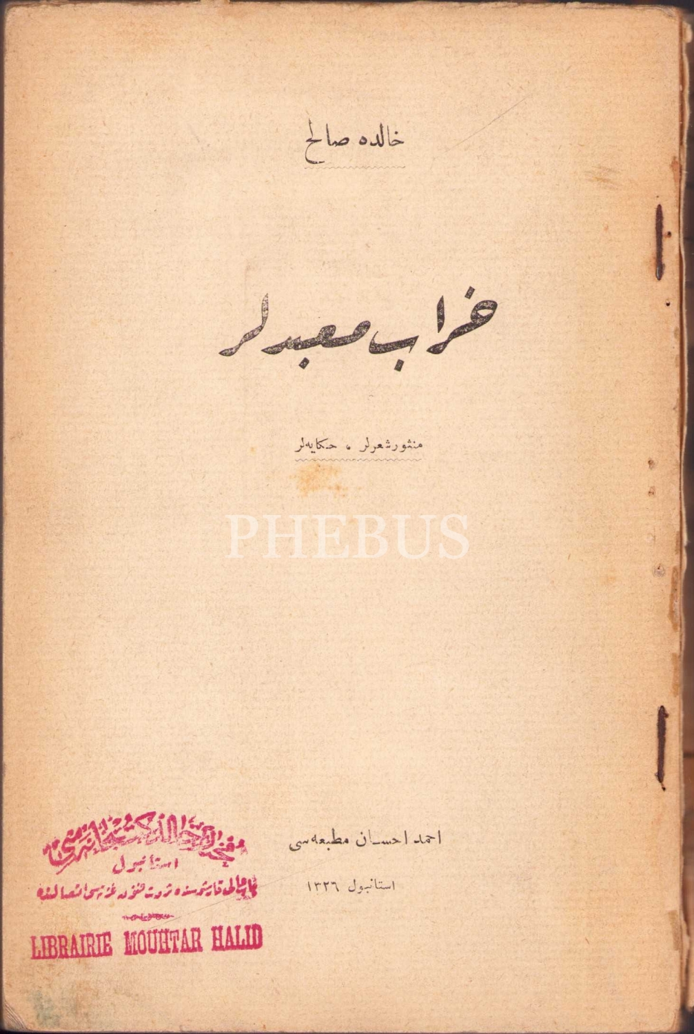 Harab Mabedler -Mensur Şiirler, Hikayeler-, Halide Salih [Halide Edib Adıvar], Ahmed İhsan Matbaası, İstanbul, 1326 tarihli, Muhtar Halid Kütüphanesi damgalı, 217 sayfa, Osmanlıca, 12x18 cm