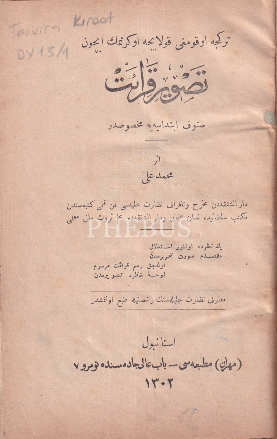 Tasvir-i Kıraat, Sınıf-ı İbtidaiyye Mahsus, Mehmed Ali, İstanbul, Mihran Matbaası, İstanbul, 1302, 95 sayfa, 13x18 cm