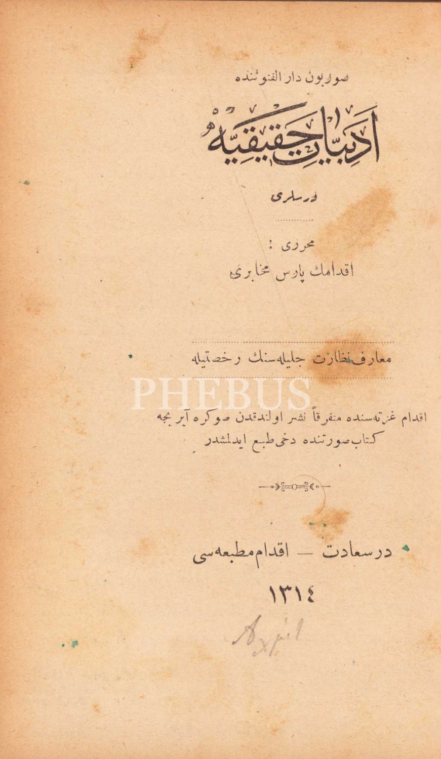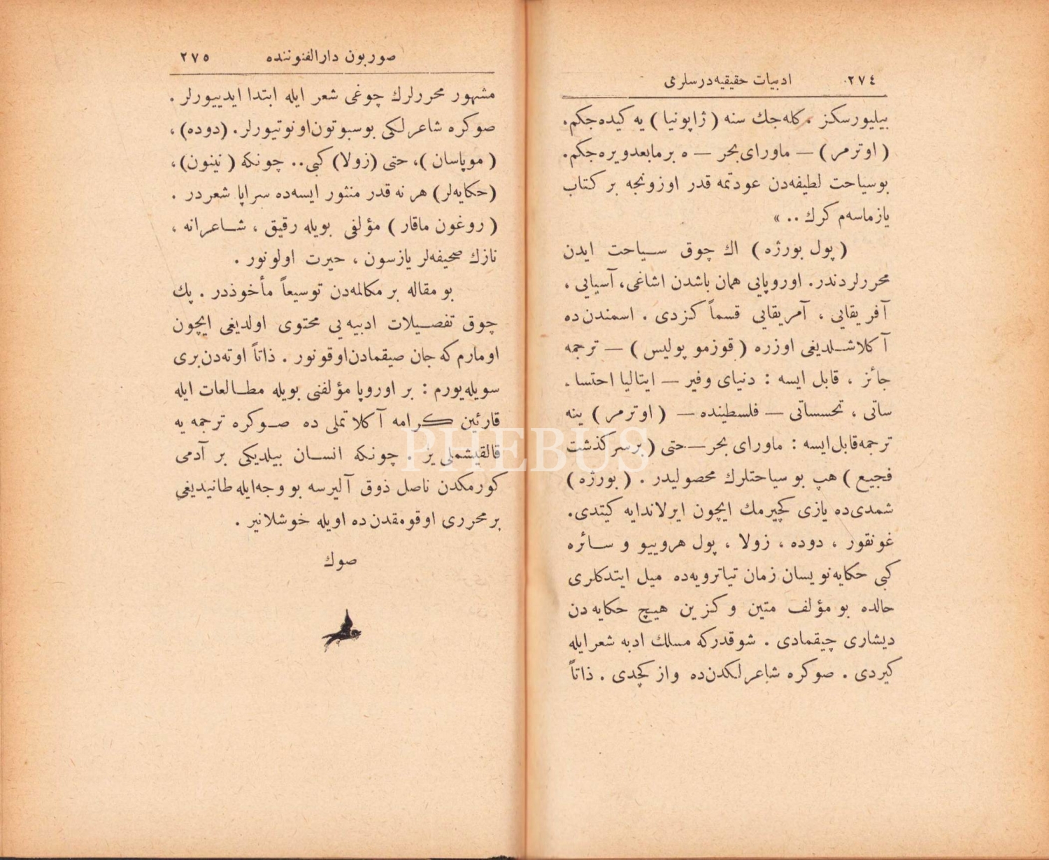 Edebiyat-ı Hakikiye Dersleri, Muharriri: İkdamın Paris Muhabiri, İstanbul, İkdam Matbaası, 1314 tarihli, 275 sayfa, 11,5x18 cm