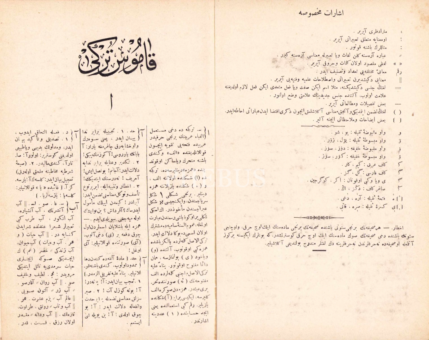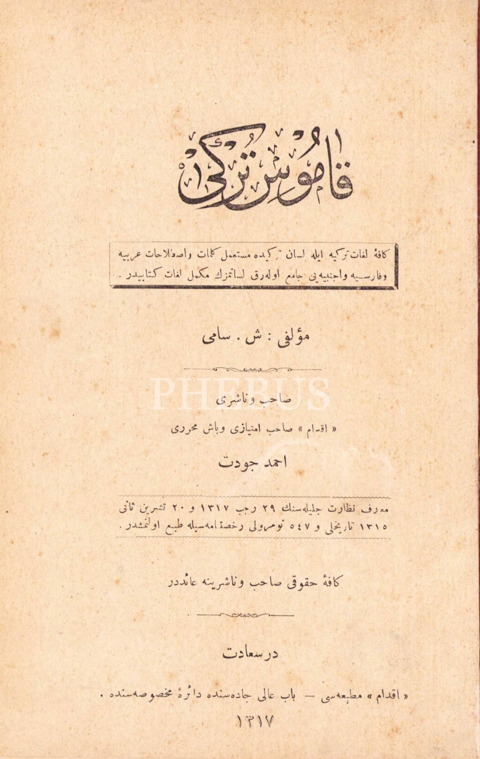 Kamus-ı Türki, Şemseddin Sami, Sahib u Naşiri: İkdam, Sahib-i İmtiyaz ve Baş Muharriri: Ahmed Cevdet, Dersaadet, 1317 tarihli, İkdam Matbaası, bazı sayfaları haliyle, 1574 sayfa, 16x23 cm