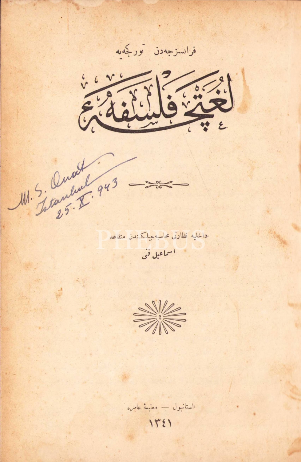 Fransızcadan Türkçeye Lugatçe-i Felsefe, İsmail Fenni, İstanbul, Matbaa-i Amire, 1341 tarihli, 935 sayfa, 15,5x23 cm