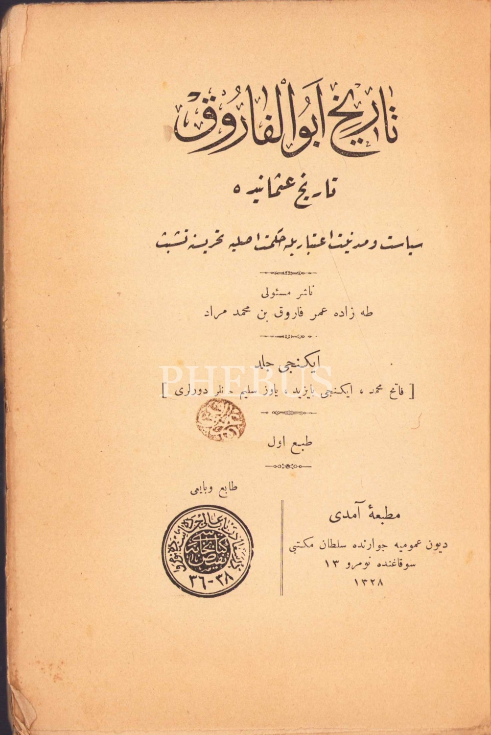 Tarih-i Ebul-Faruk, İkinci Cild, Birinci Baskı, Matbaa-i Amidi, 1328 tarihli, 326 sayfa, 14x21 cm
