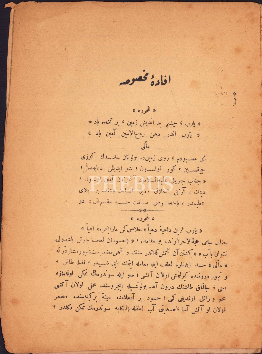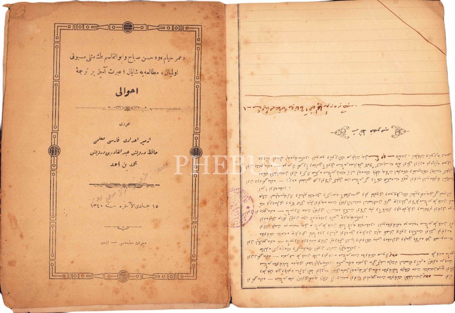 Ömer Hayyam ve Hasan Sabbah ve Ebü’l-Kasım’ın Misli Mesbûk Olmayan ve Mütâlaâya Şayan İbret-Âmiz Bir Tercüme-i Ahvâli, Muhariri: Mehmed b. Ahmed, Marifet Matbaası, İzmir, 1340 tarihli, 22 sayfa, 15x21 cm,