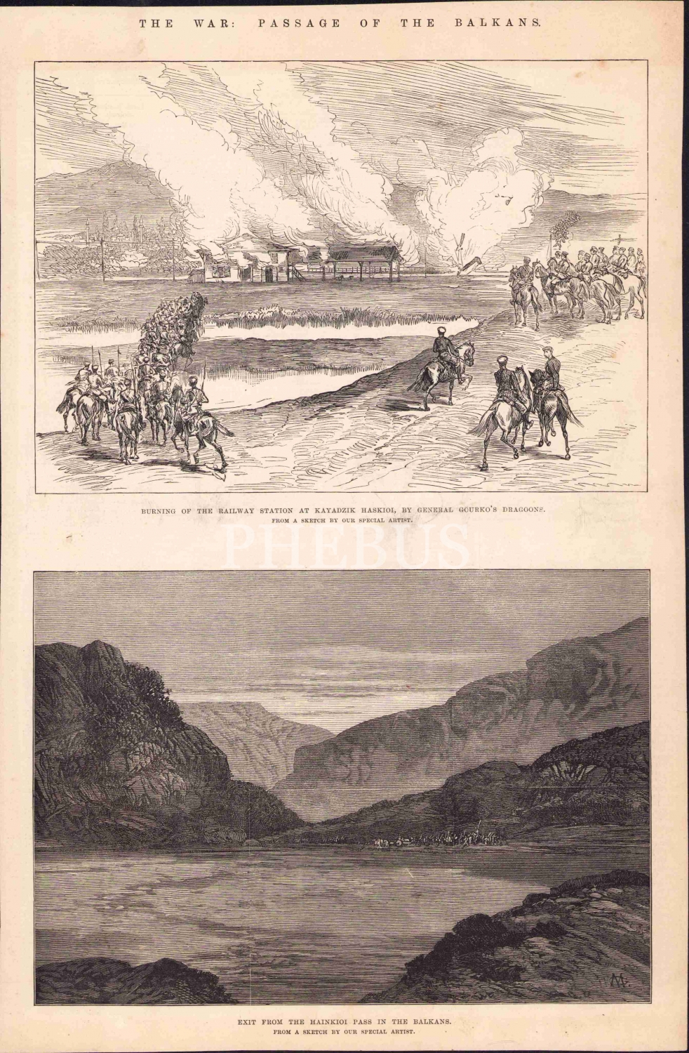 Osmanlı dönemi gravür, Türk - Rus Savaşı, 1877, "Balkanların geçişi", dergiden kesilmiş, 22x34 cm