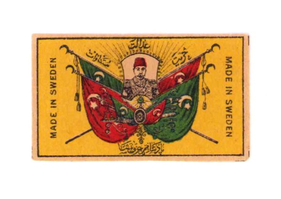 Sultan Reşat ve türk bayrağı görselli, adalet, hürriyet, müsavat ve padişahımız çok yaşa yazılı Osmanlı kibrit etiketi, 5x3cm