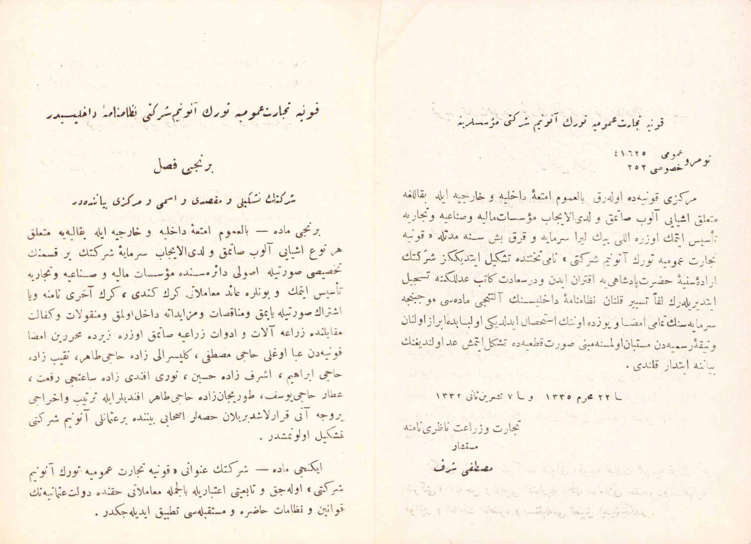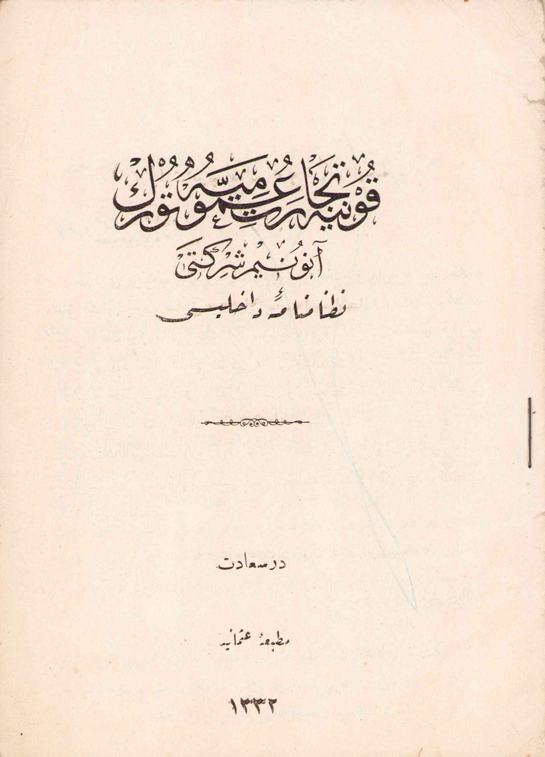 1332 tarihli Konya Ticaret-i Umumiye Türk Anonim Şirketi Nizamnamesi, Dersaadet, Matbaa-i Osmaniye, Osmanlıca, 22 sayfa, 13x18cm