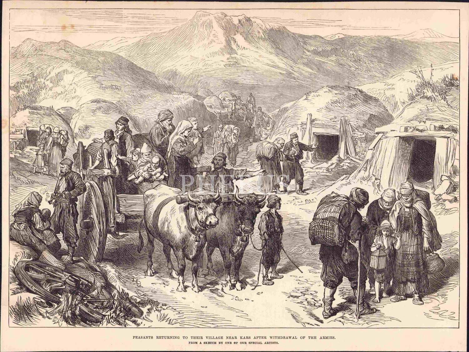 Osmanlı dönemi gravür, Türk - Rus Savaşı, 1877, Orduları geri çekildikten sonra köylerine geri dönen köylüler, 30x24 cm